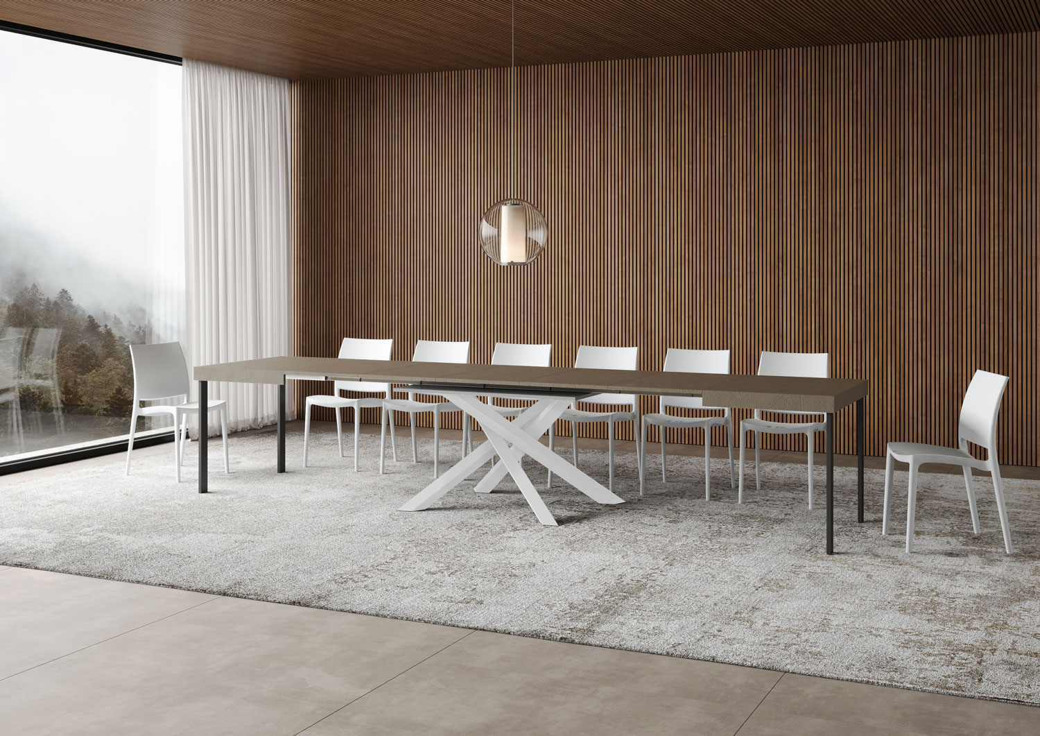 Rozkládací stůl Volantis o délce 120 cm se svým sofistikovaným moderním designem se přizpůsobí jakémukoli interiéru a je ideální volbou jak jako jídelní stůl, tak i jako kus nábytku do obývacího pokoje, kde můžete stylově přivítat hosty. Rozkládací stůl Volantis lze postupně rozložit až na 380 cm, což pojme 16 osob. Rozkládací systém je vyroben z melaminových panelů, železných nohou a skládací desky a disponuje hliníkovými teleskopickými výsuvy a přiloženými bočními podpěrami, díky čemuž je stůl stabilní a pevný i v plném rozložení. Dvě rozkládací desky jsou umístěny pod deskou stolu a jsou připraveny k použití, zatímco zbývající tři lze uskladnit jinde. Produkt Itamoby Vyrobeno v Itálii Rozměry: Složený stůl: D. 120 H. 90 V. 77 cm Délka s 1 rozkládací deskou: 172 cm Délka se 2 rozkládacími deskami: 224 cm Délka se 3 rozkládacími deskami: 276 cm Délka se 4 rozkládacími deskami: 328 cm Délka s 5 rozkládacími deskami: 380 cm