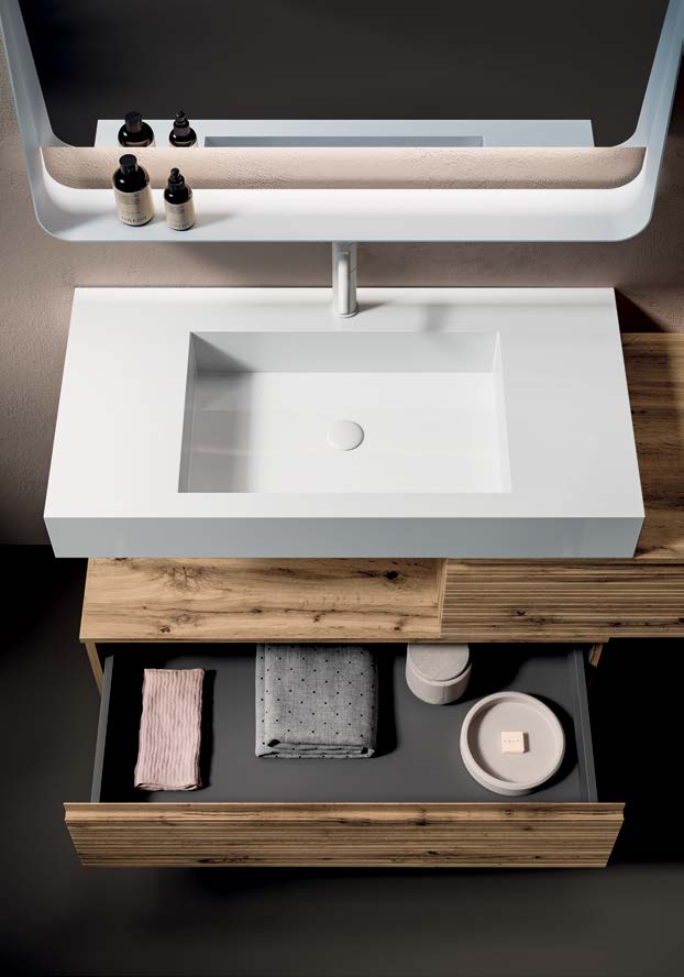 Kompozice Saturno 113 od Oltrebagno je závěsná koupelnová skříňka s lineárním a moderním designem, určená pro ty, kteří hledají elegantní, uklizený a funkční prostor. Vysoce kvalitní povrchová úprava v kombinaci s jednoduchými tvary činí z tohoto řešení ideální řešení pro moderní koupelny.