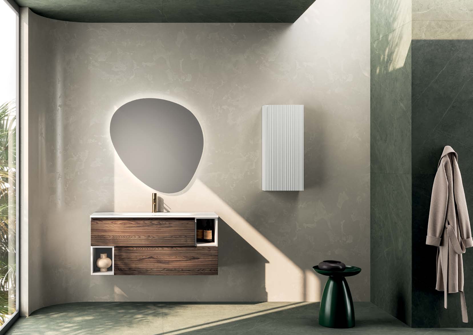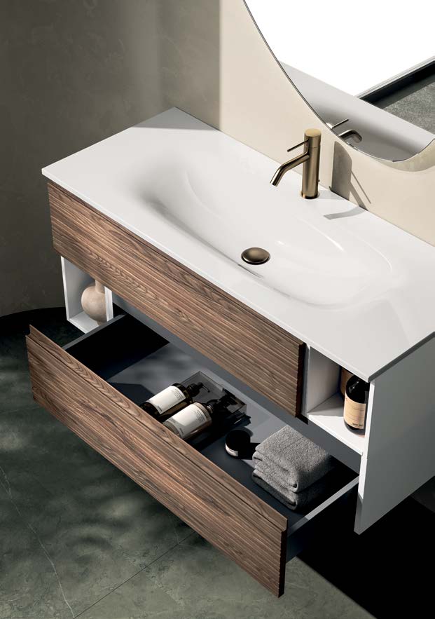 Integrovaný keramický nebo pryskyřičný dřez, v závislosti na zvolené konfiguraci, dodává sadě nádech elegance, zatímco sladěné zrcadlo s volitelným LED osvětlením doplňuje sadu a činí ji praktickou a harmonickou.