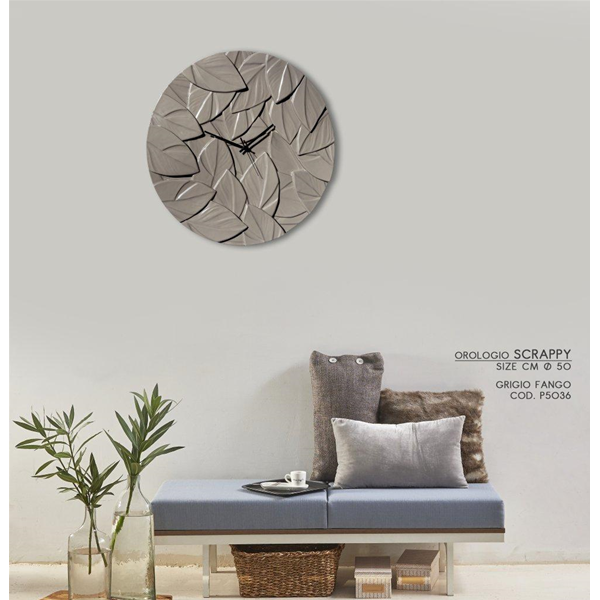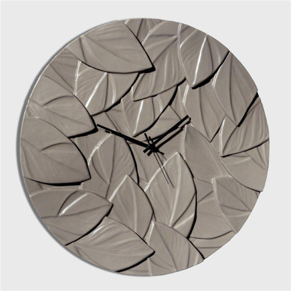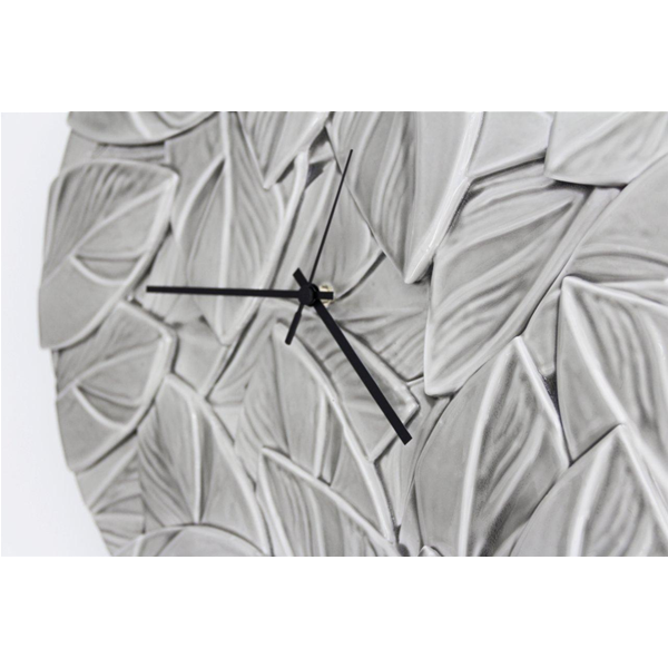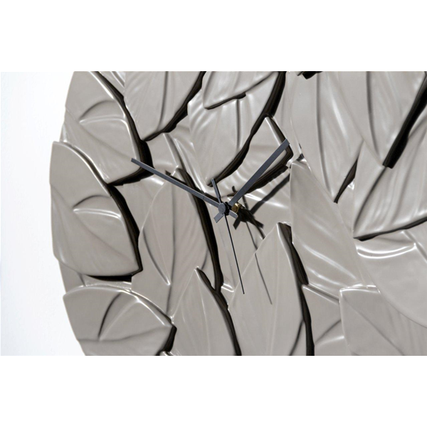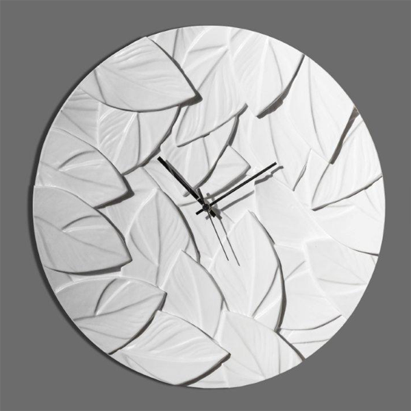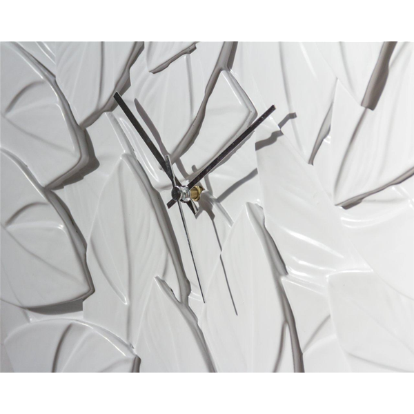 Basreliéfní hodiny na pryskyřici s lesklou povrchovou úpravou a centrálními hodinami s černými ručičkami.
