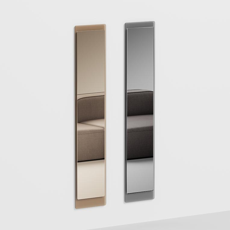 Zrcadlo je namontováno na 12mm ekologickém laminátovém panelu, který dosahuje až k podlaze a integruje systém upevnění na zeď. Lze jej také ukotvit do knihovny 0/544.