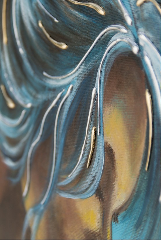 Ručně zdobené reliéfními pryskyřičnými detaily, zlatými a stříbrnými listy na plátěné struktuře.