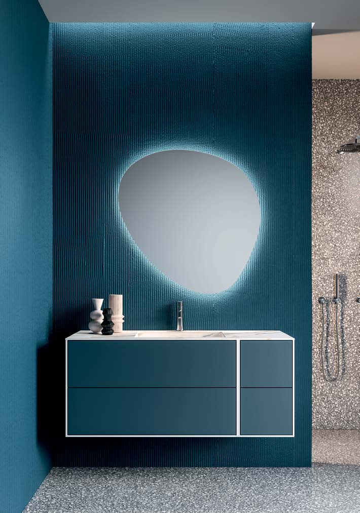 Integrovaný dřez zdůrazňuje základní linie skříňky, zatímco sladěné zrcadlo , které je k dispozici také s LED osvětlením, zajišťuje optimální osvětlení pro každou potřebu.