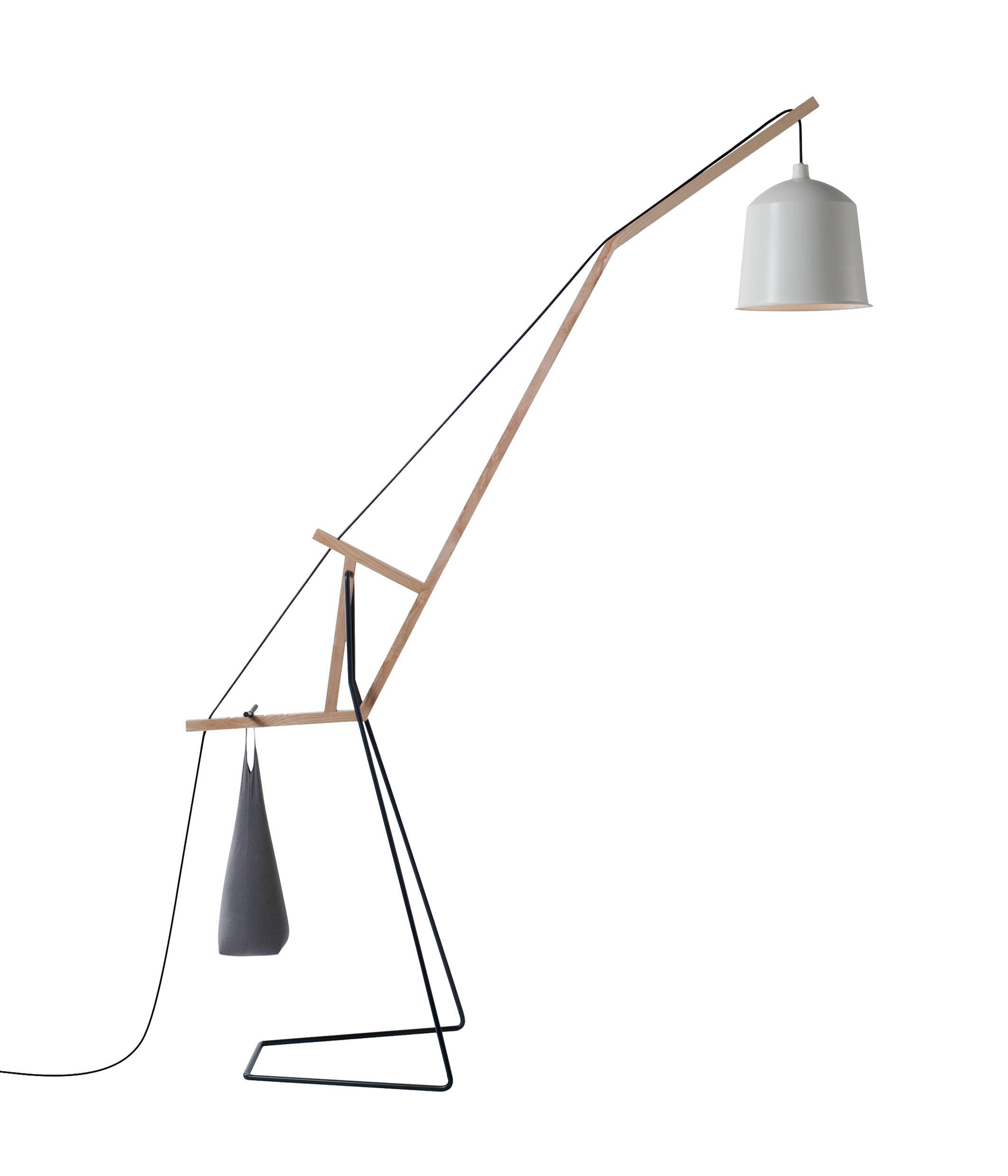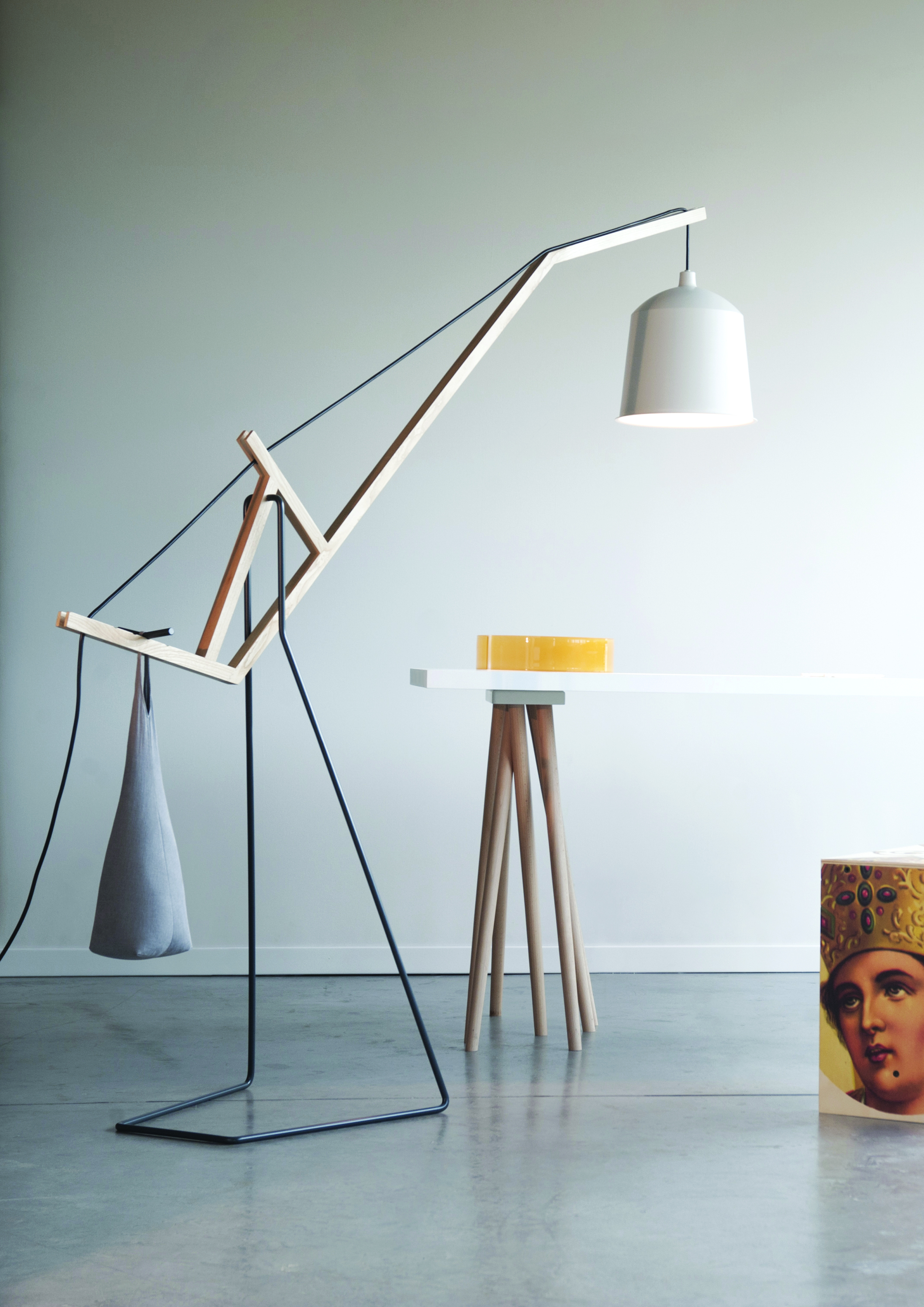 Dlouhý jeřáb se klene nad místností a vyvažuje stínidlo na jedné straně oproti pytli s pískem na druhé.