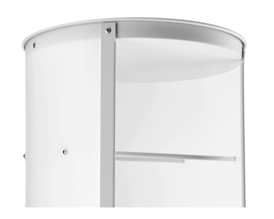 Podstavec a vrchní deska jsou k dispozici v šedém, bíle lakovaném kovu nebo přírodním dřevě.