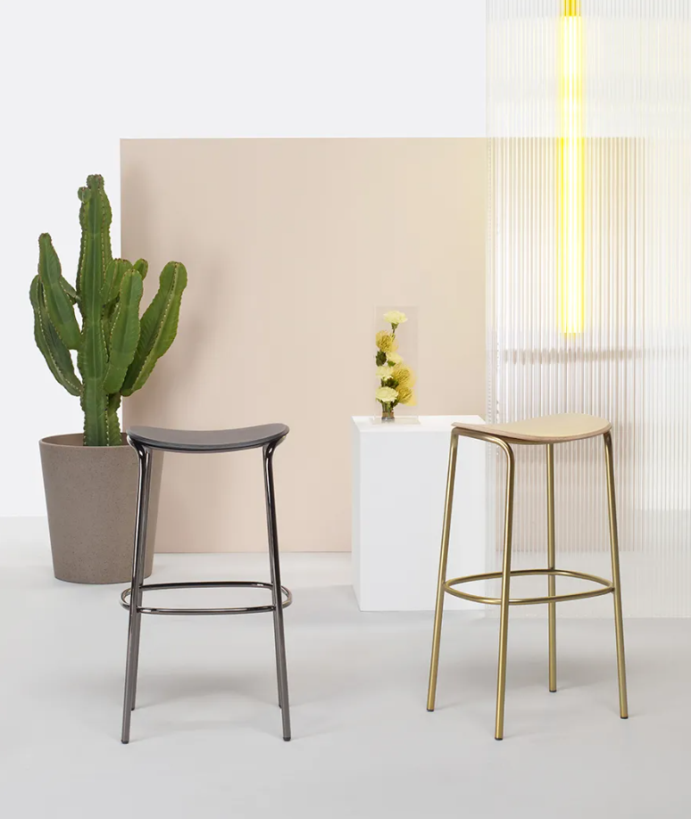 Trick Wood je stolička s tenkým, ale výrazným profilem, kde zakřivené linie kovového rámu vytvářejí lehký, dynamický a překvapivě příjemný dojem.