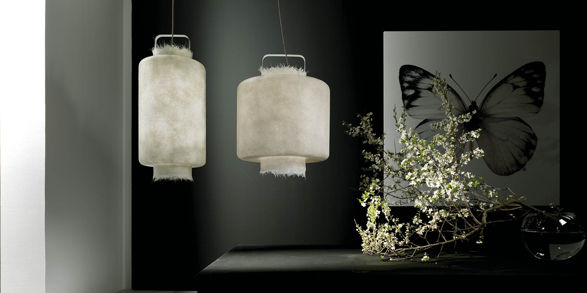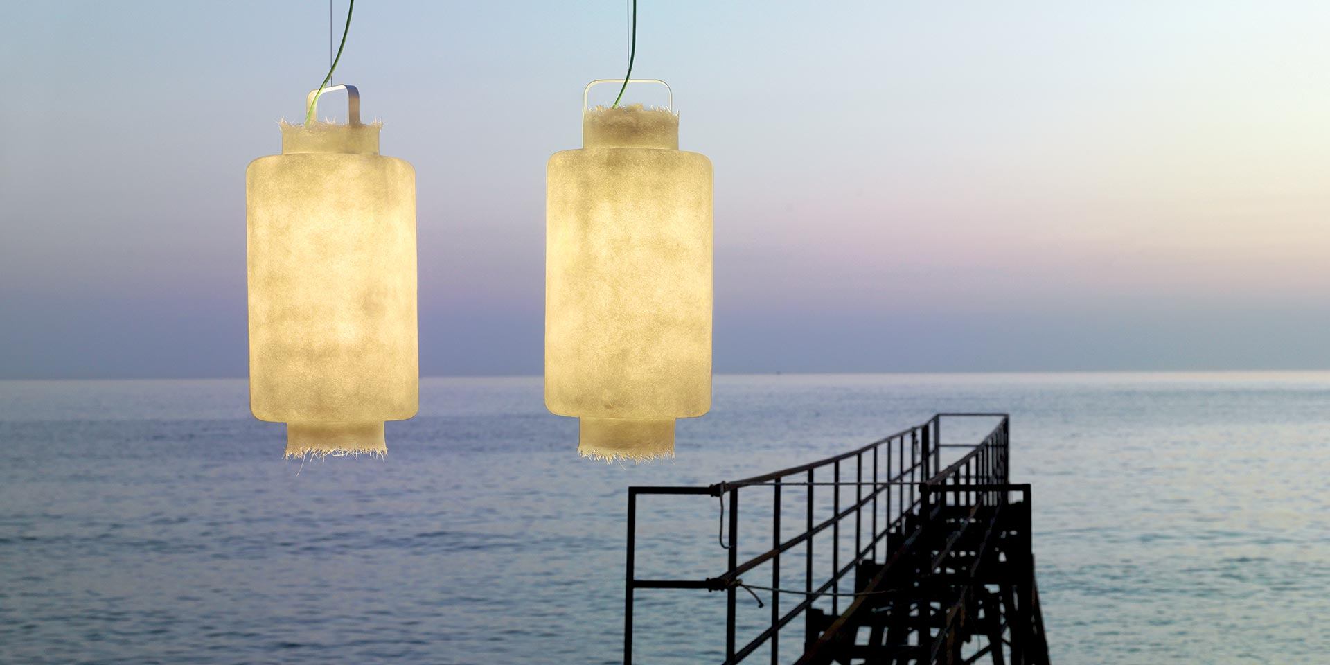 Kimono Karman, venkovní závěsné svítidlo s teplým, plným světlem, lucerna, která zaujme a udrží světlo, jejíž tvar jako by splýval s okolním vzduchem. KIMONO, vnitřní i venkovní závěsné svítidlo, které může vaší zahradě dodat skutečně originální nádech a je bezpečné díky krytí IP65.