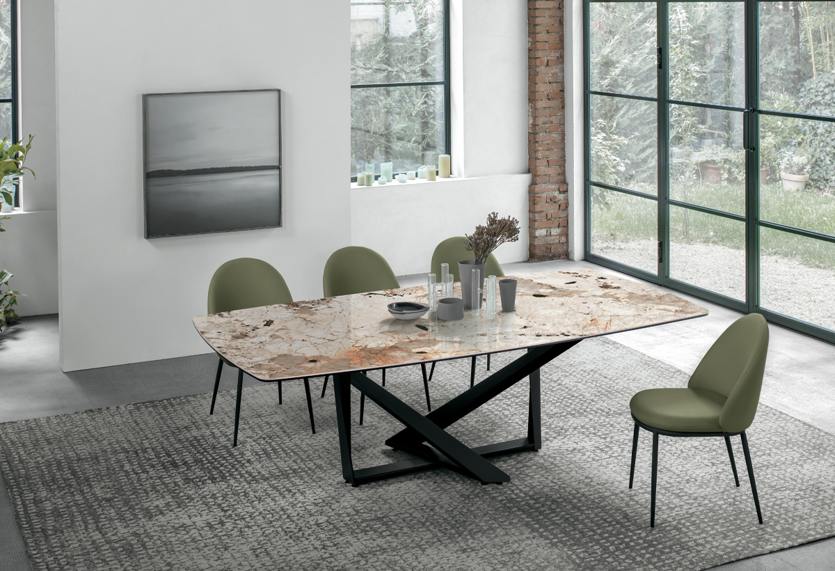 Stůl Priamo, vyrobený z porcelánové kameniny , přináší eleganci a všestrannost, díky čemuž je ideální do moderního a rafinovaného prostředí.