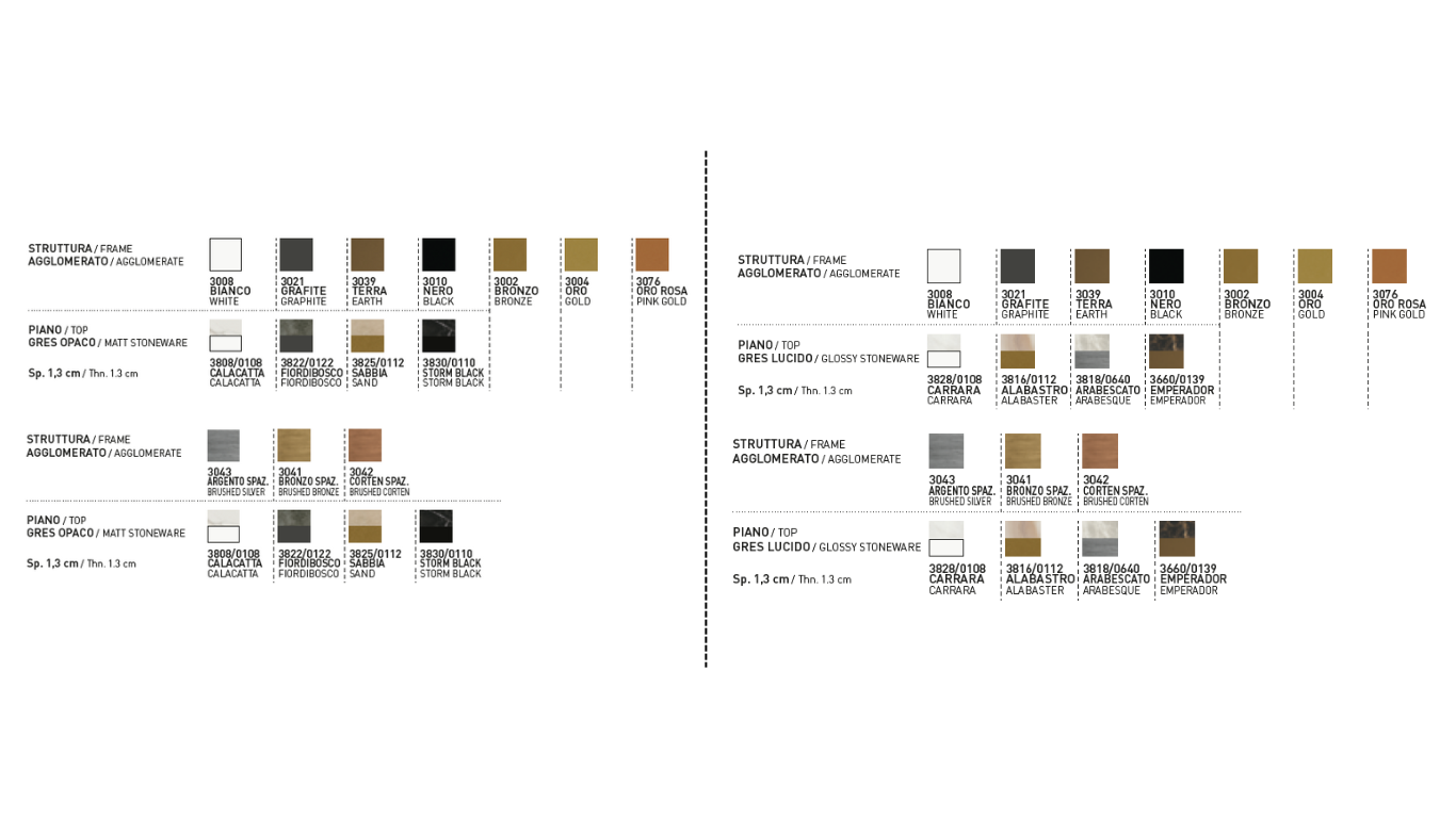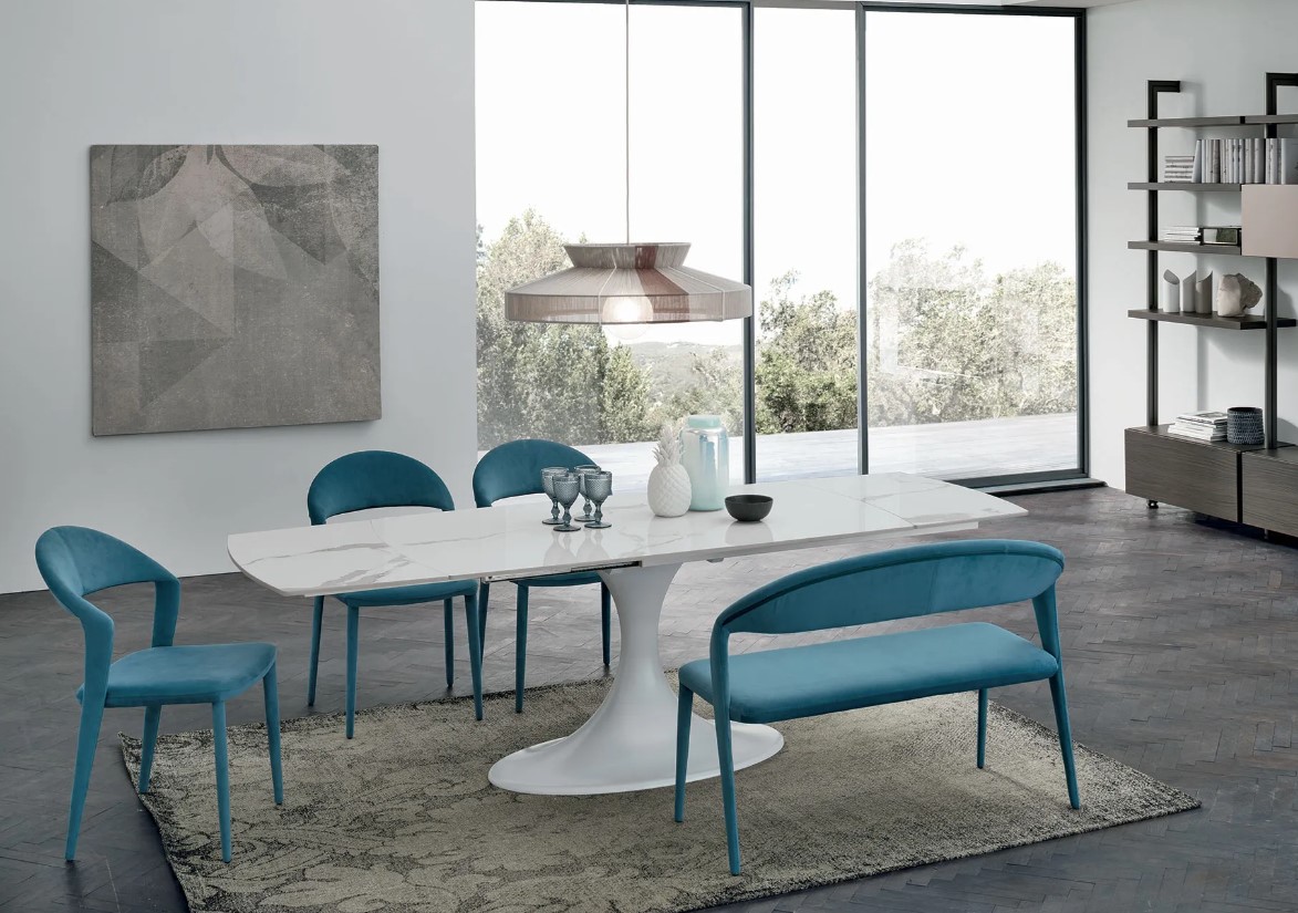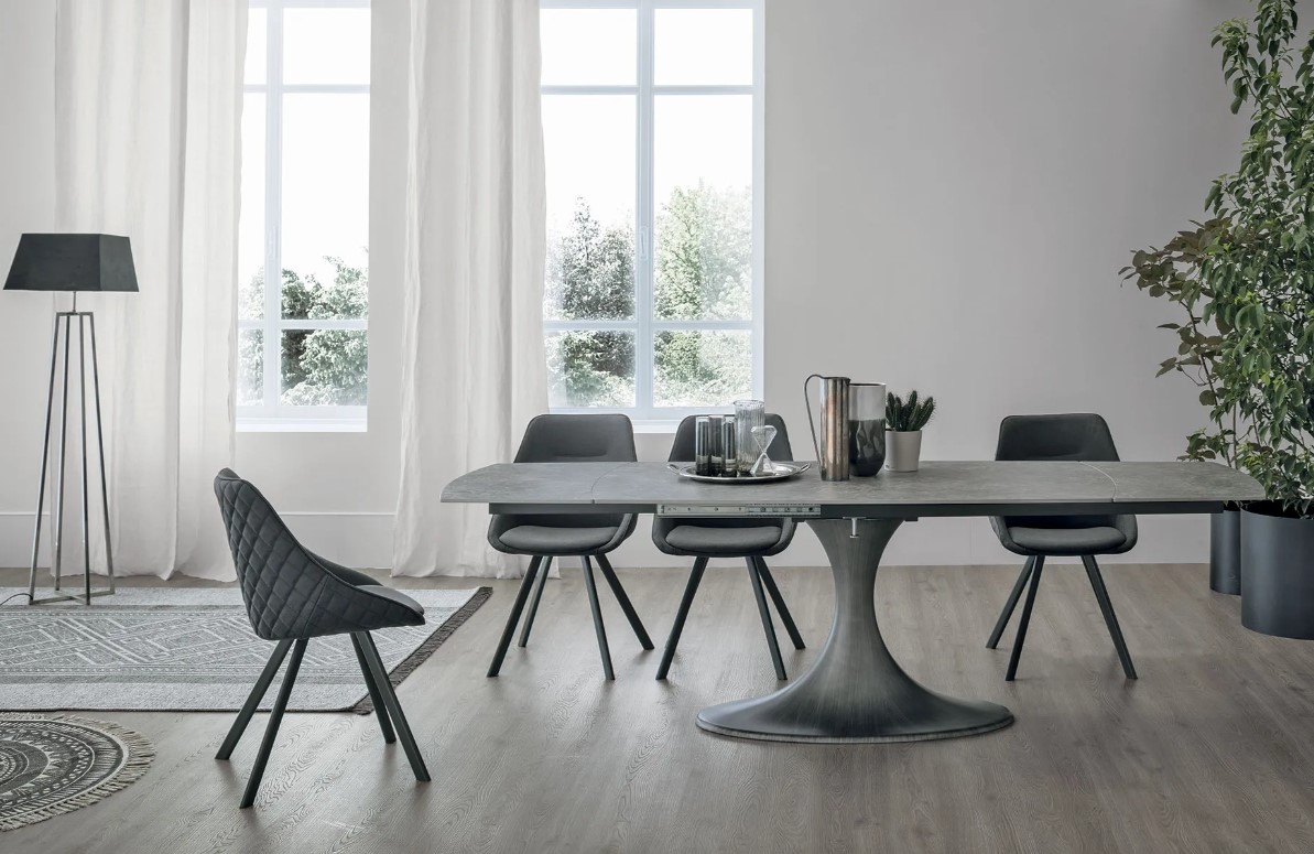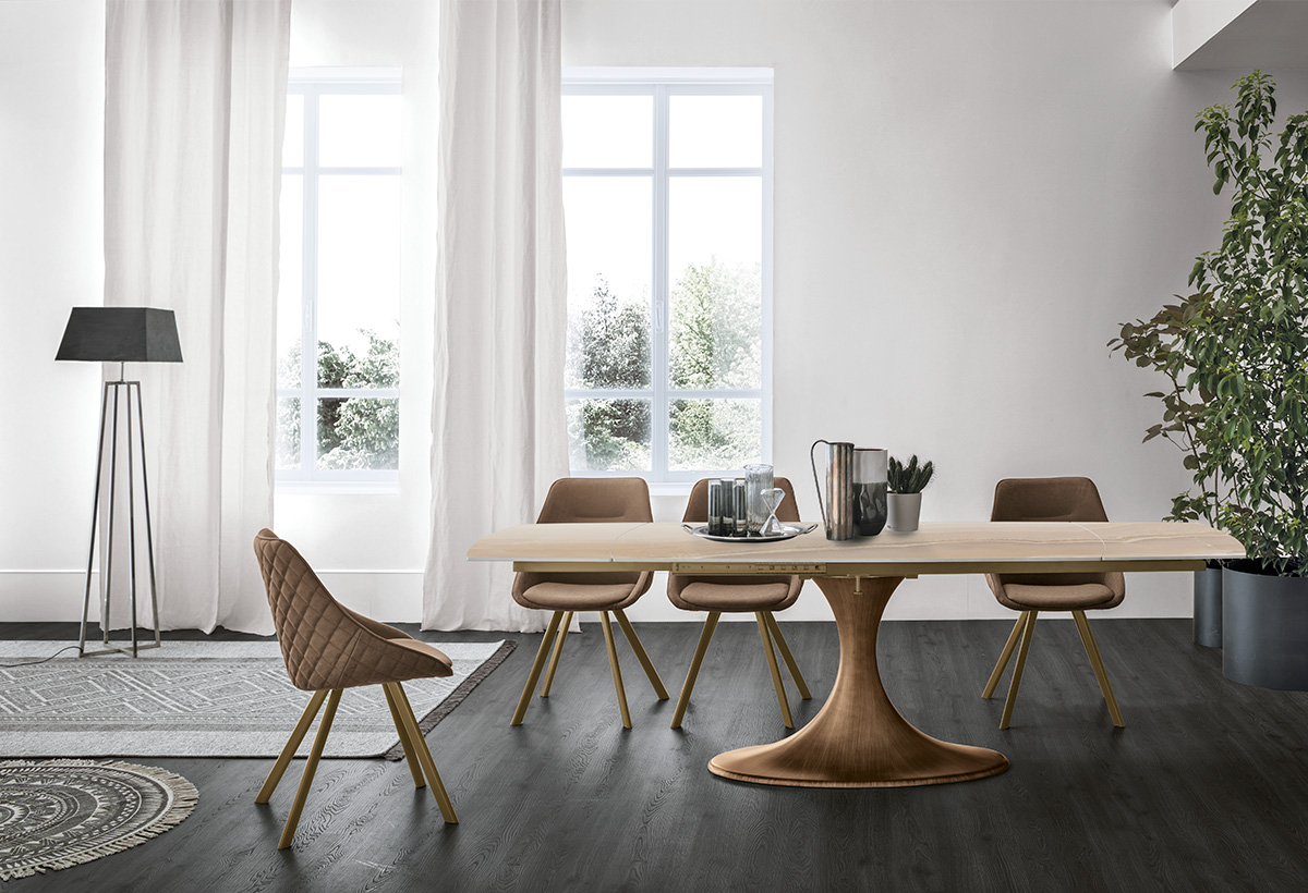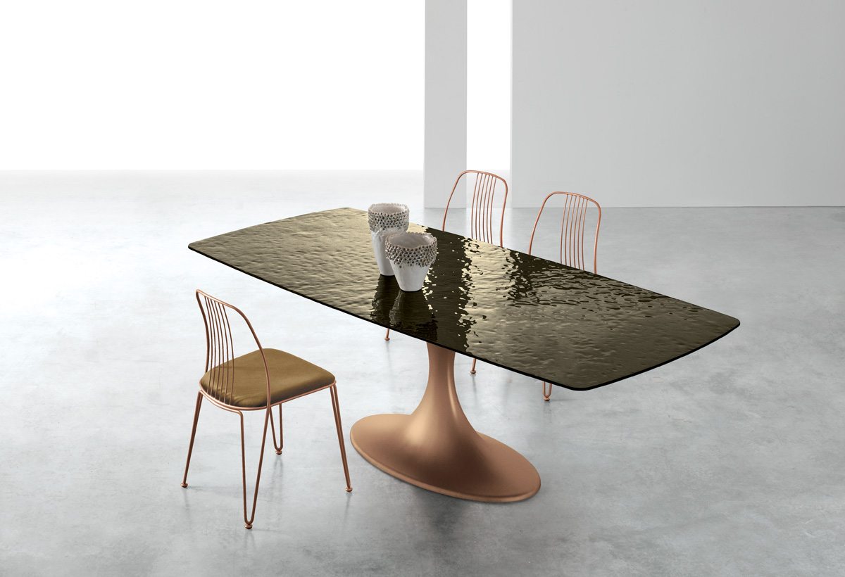 Stůl Calice vyniká svou centrální podnoží, která elegantně připomíná tvar kalichu a je vyrobena z aglomerátu, což stolu dodává sochařský a rafinovaný vzhled.