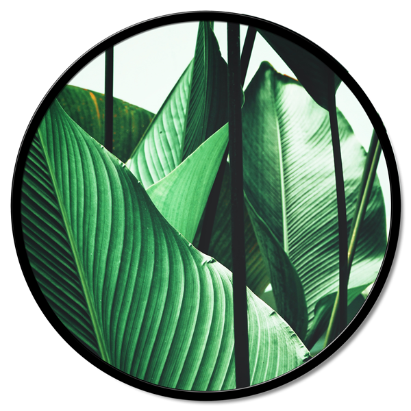 Kulatý panel z dřevěných vláken potažený čistým bavlněným plátnem s potiskem ve vysokém rozlišení a s matně lakovaným kovovým rámem.