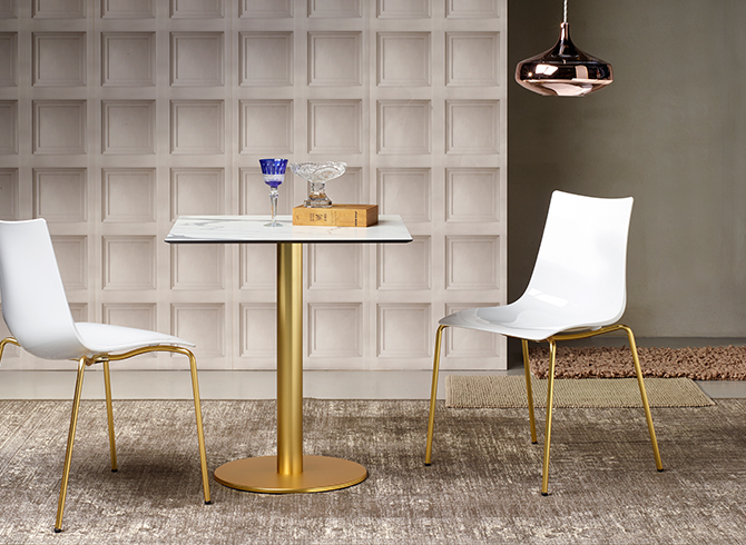 Čtyřnohý rám je k dispozici ve dvou povrchových úpravách: chromovaná ocel pro elegantní a moderní vzhled nebo rafinovaná saténová mosazná povrchová úprava, která dodává nádech luxusu a sofistikovanosti.
