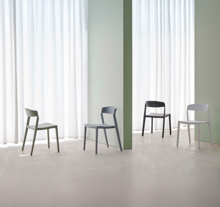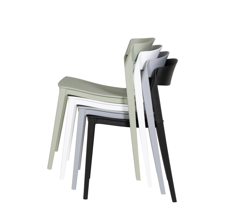 Jeho měkká, zakřivená konstrukce je navržena pro větší ergonomické pohodlí. Nohy, rovněž vyrobené z polypropylenu, zajišťují stabilitu, aniž by to ohrozilo jeho lehký a štíhlý vzhled.