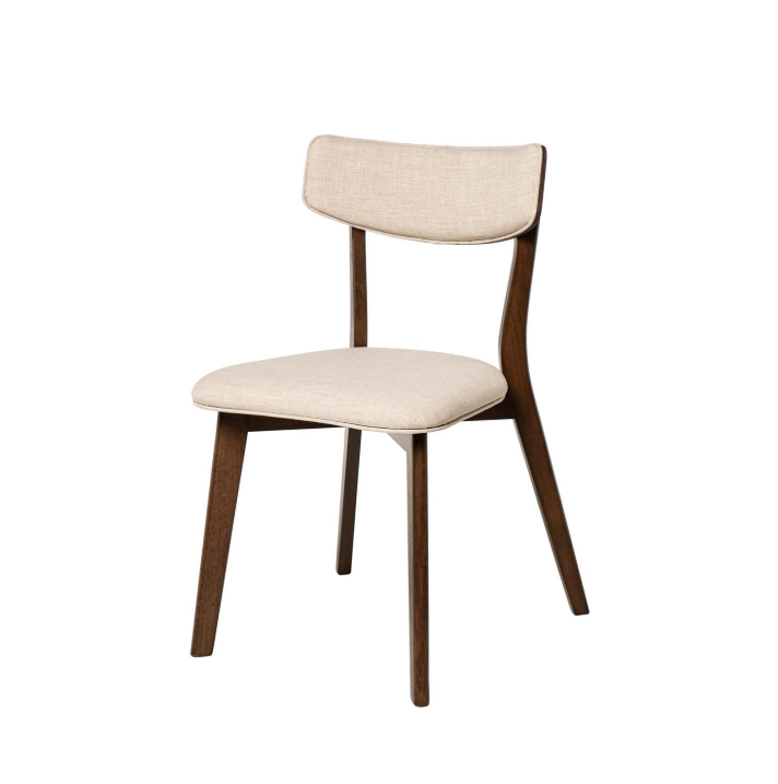 Dřevěná židle ANAIS je vyrobena z ořechové dýhy a čalouněna béžovou látkou (100% polyester) na opěradle a sedáku.