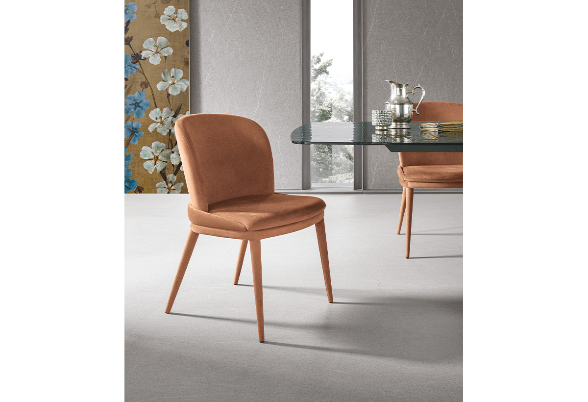 Židle je čalouněna měkkou látkou s efektem sametu, která jí dodává nádech elegance a sofistikovanosti, takže se perfektně hodí jak do klasického, tak i do moderního prostředí.