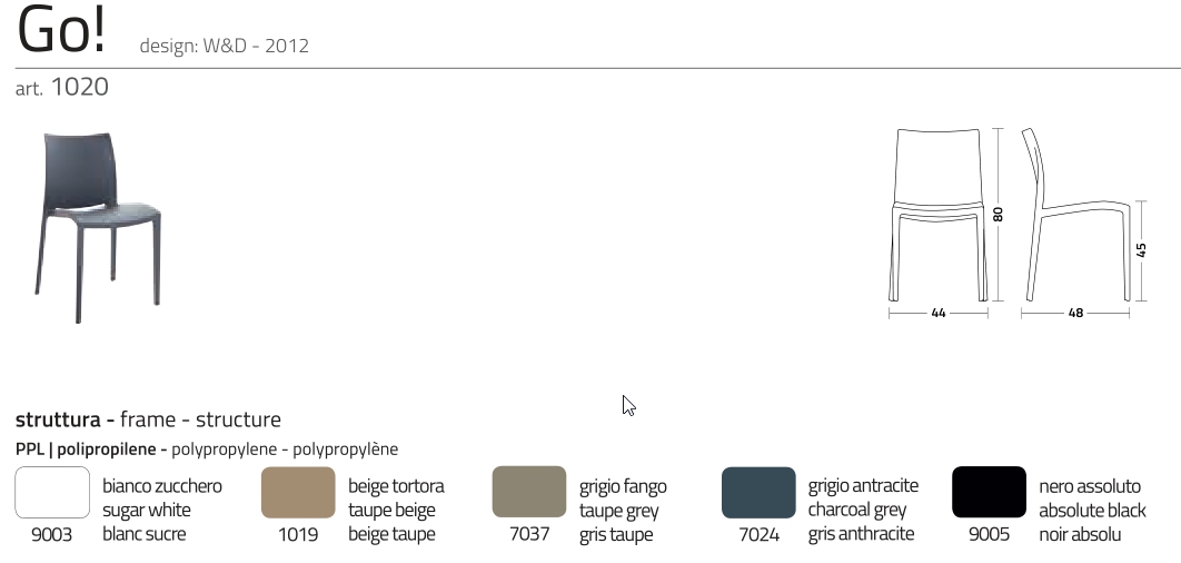 Stohovatelná židle z měkkého polypropylenu, recyklovatelná a vhodná pro venkovní použití.