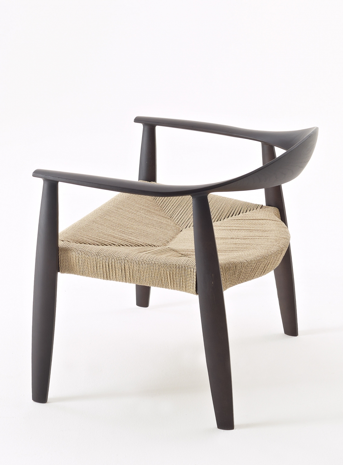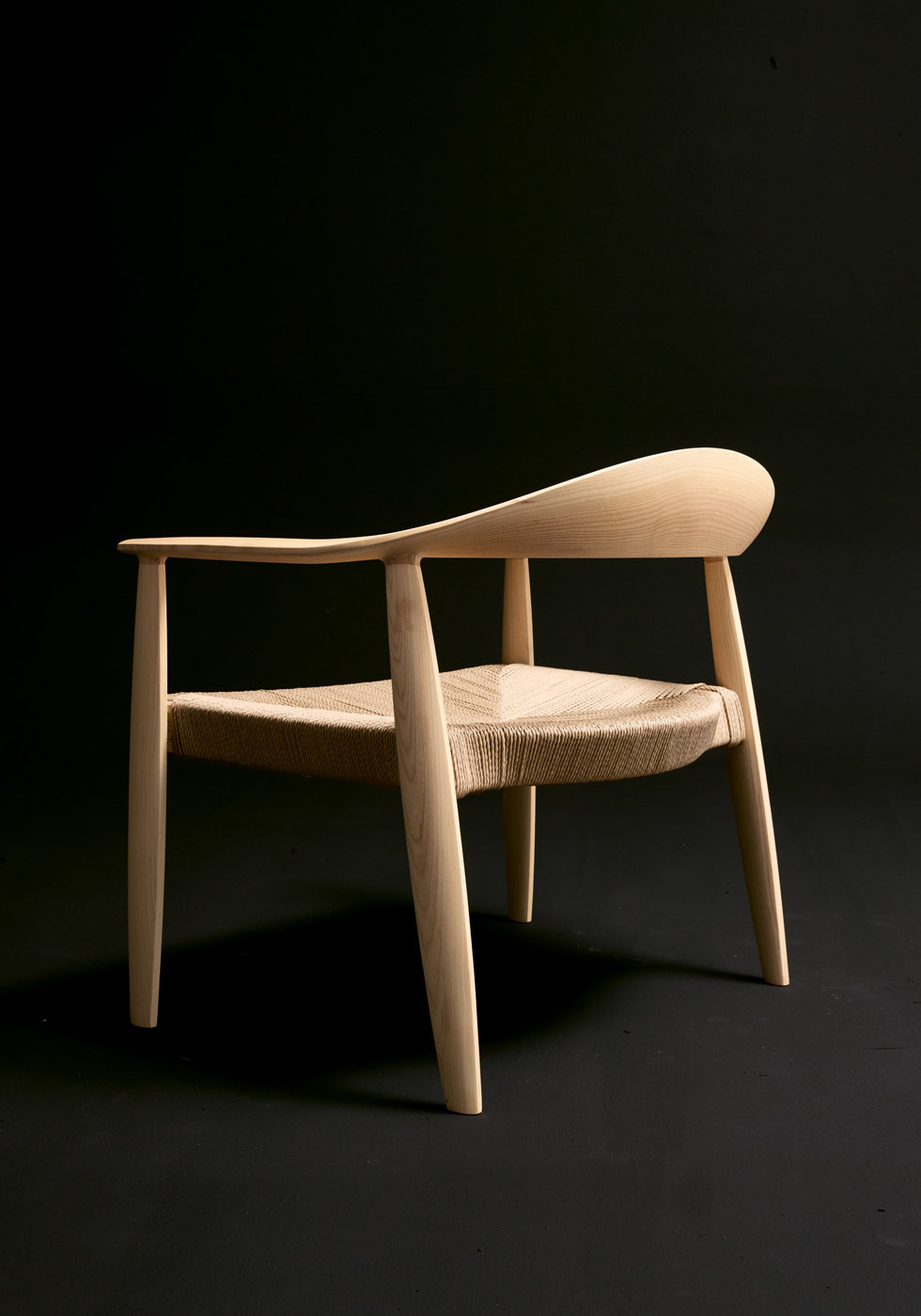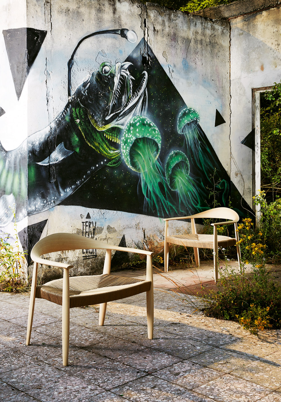 Křeslo s rámem z jasanového dřeva a sedákem z ručně tkané slámy nebo čalouněným látkou či kůží.