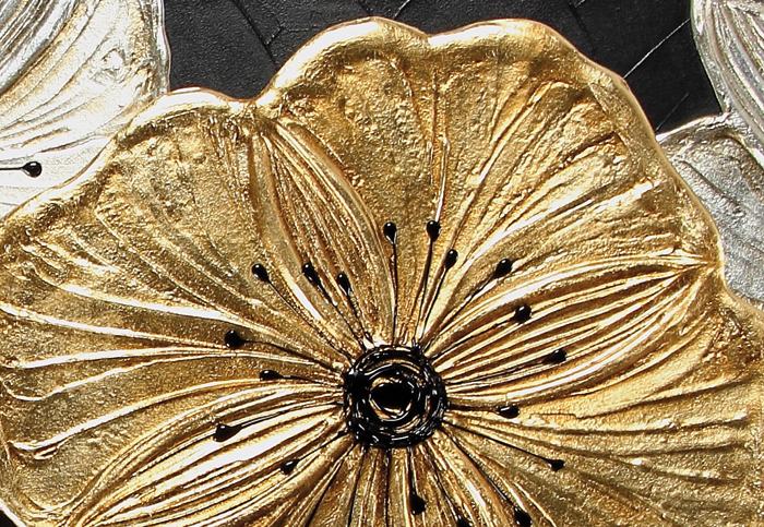 DESIGNOVÝ ŠTĚTEC cm 115x55 ZLATÁ varianta Květinová kompozice na plátně, ručně zdobená, pryskyřičné detaily na texturovaném materiálu, struktura do dvojitého L s centrálním reliéfním prvkem, lesklá povrchová úprava.
