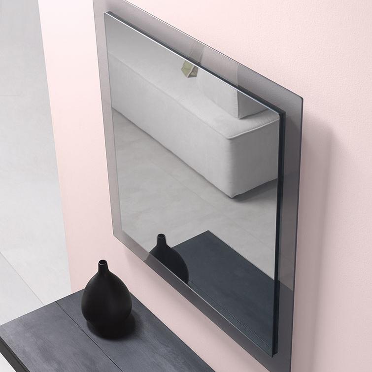 Zrcadlo Elodie s kouřově šedým (nebo bronzovým) průhledným sklem, které rámuje zrcadlové sklo stejné barvy.