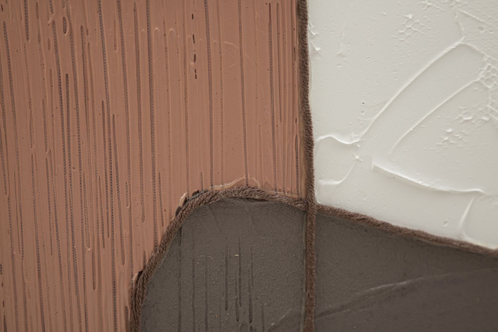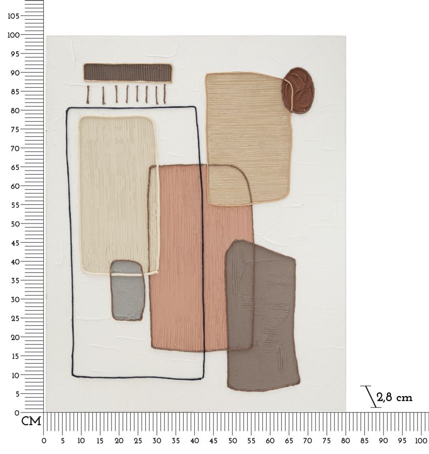 Dipinto su tela completo di telaio in legno dal design astratto con applicazioni.
