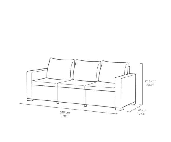 Con dimensioni generose di 198x68x71,5 cm, è dotato di comodi cuscini sfoderabili in poliestere color sabbia, perfetti per garantire una seduta morbida e facilitare la pulizia.