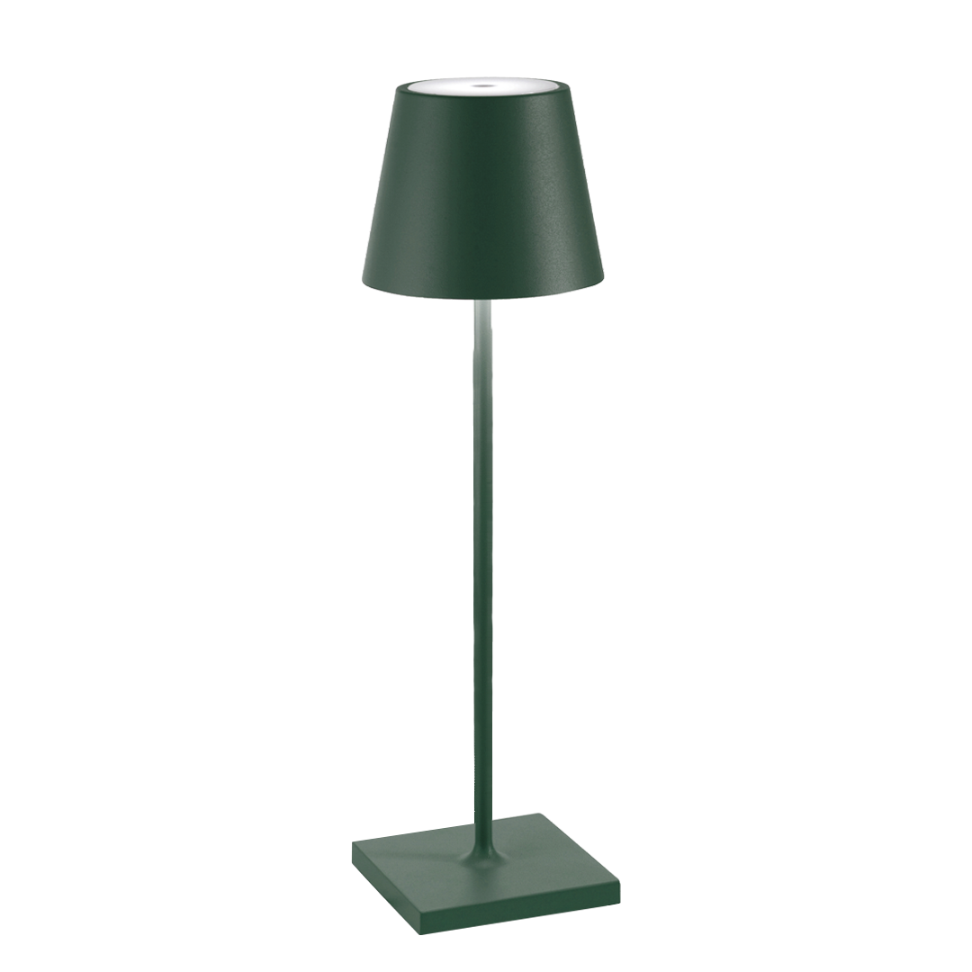 Genopladelig bordlampe med kontaktopladerbase, med malet aluminiumsarmatur, polycarbonatdiffusor og LED-lyskilde.