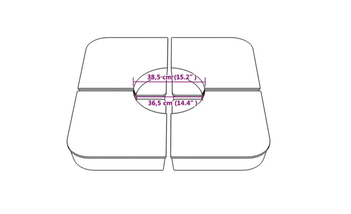 - Nem at bruge: Dette paraplybasesæt består af fire plader, der nemt kan samles for at fastgøre tværstangsbasen (medfølger ikke). Med en bred åbning er paraplybasen nem at fylde eller tømme med sand.