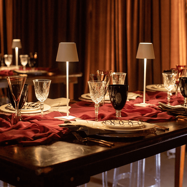 Genopladelig bordlampe med kontaktopladerbase, med malet aluminiumsarmatur, polycarbonatdiffusor og LED-lyskilde.