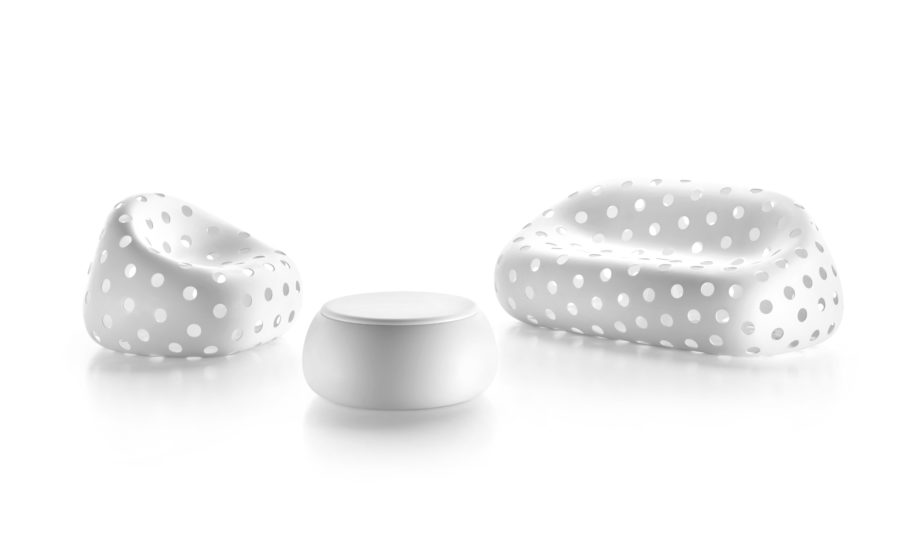 Den stammer fra "Gumball"-familien og har en slående visuel effekt, der er velegnet til rum, der kræver løsninger med stærk personlighed. Den perforerede overflade "tømmer" genstandene og giver en følelse af lethed, der er hidtil uset for denne type møbler.