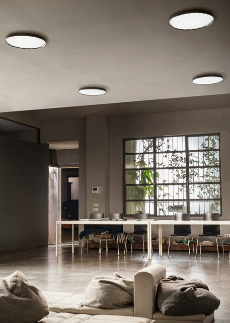 Pendelversionen er monteret på et stift rør, mens loftversionen også fås med skjult tilbehør til montering på gipsplader.