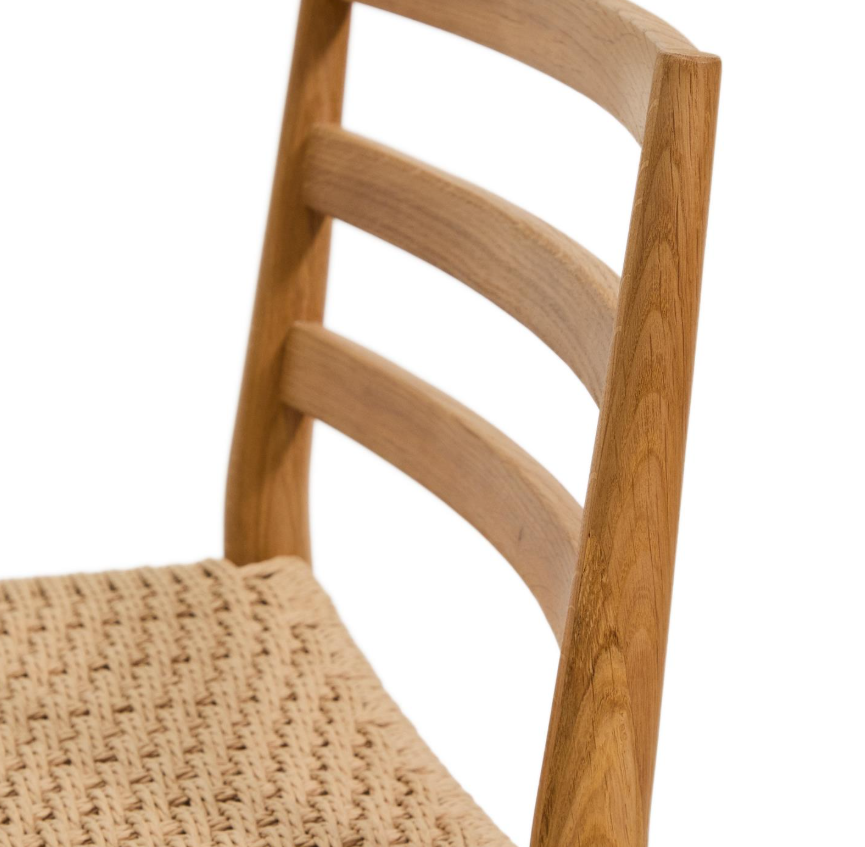 Denne skammel med ryglæn kombinerer varmen fra massivt egetræ med ægtheden af håndværk. Sædet er lavet af håndvævet papirgarn, hvilket tilføjer tekstur og en karakteristisk detalje. Hvert møbel er unikt takket være de naturlige variationer i træet med dets karakteristiske årer og farver, der gør hver skammel unik. Den robuste ramme sikrer stabilitet og holdbarhed, mens ryglænet tilbyder ekstra komfort til daglig brug. Træet er 100% FSC™-certificeret med sporbarhedskæde og ansvarligt forvaltede skove. Et møbel, der skiller sig ud med sit tidløse design, ideelt til køkkener, bordplader og opholdsrum.