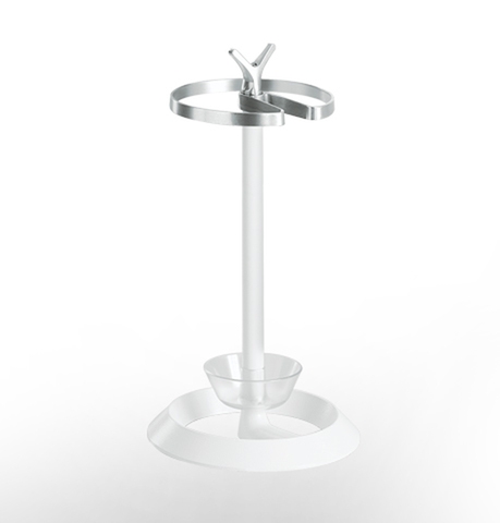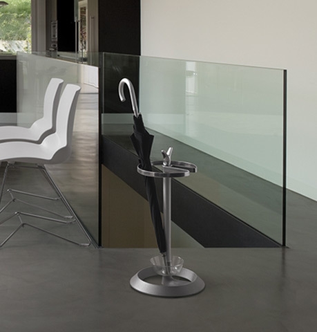 1692-I: Gulvparaplystativ med Ø 350 mm stålfod beklædt med rustfrit stål udstyret med en forkromet zamak-ring til fastgørelse af stativet og filtpuder til at beskytte gulvet.
