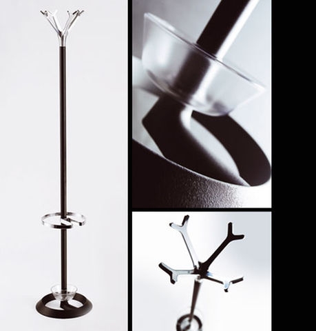 Gulvstativ med støbejernsfod malet med epoxypulver i tekstureret sort, sølvgrå eller mat hvid, med en cirkulær form udhulet indeni.