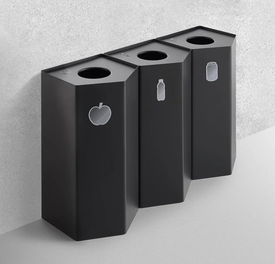 Femkantet affaldsbeholder til separat affaldsindsamling i sortlakeret stål, 1 mm tyk.