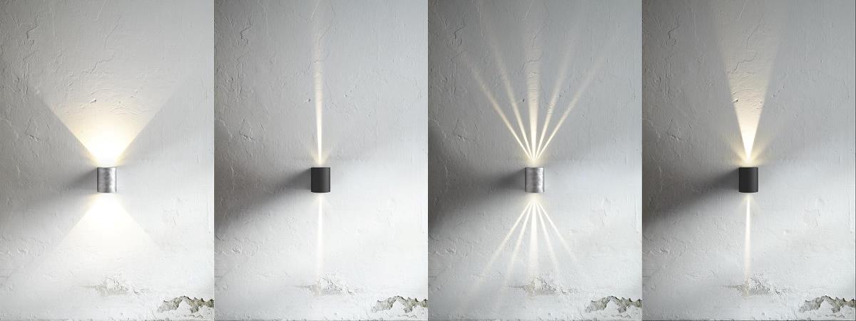 Udendørs spotlight i metal og glas, med 3 diffusere til 3 forskellige lystyper.