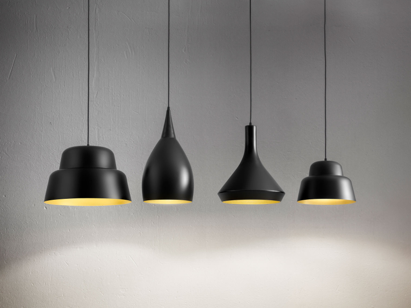 Serie af pendellamper med bløde og alsidige former, lavet af emaljeret aluminium.