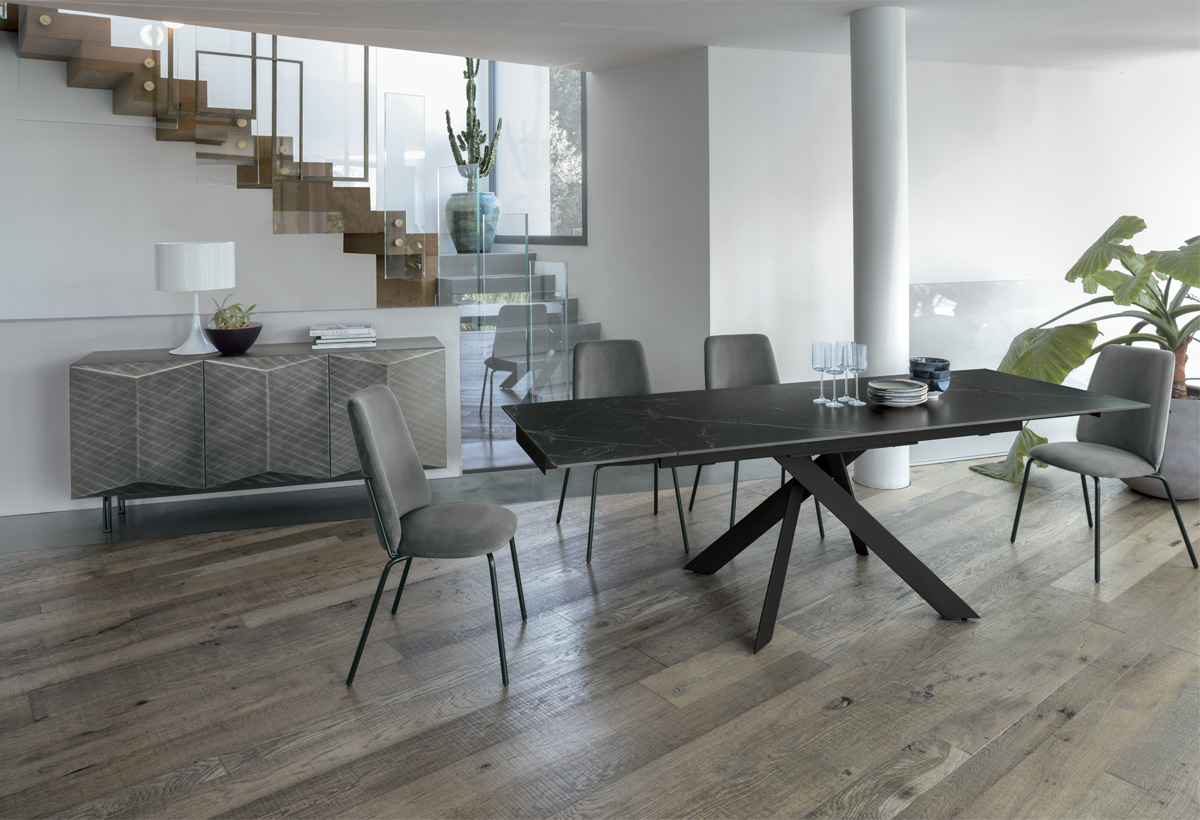 Dette bord er lavet med en bordplade i stentøj og sideforlængere, der fås i en mat eller blank finish, og det skiller sig ud med sin høje kvalitet og alsidighed .