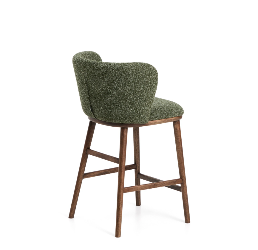 Ciselia skammel i tyk mørkegrøn chenille og ben i massivt asketræ med valnøddefinish.