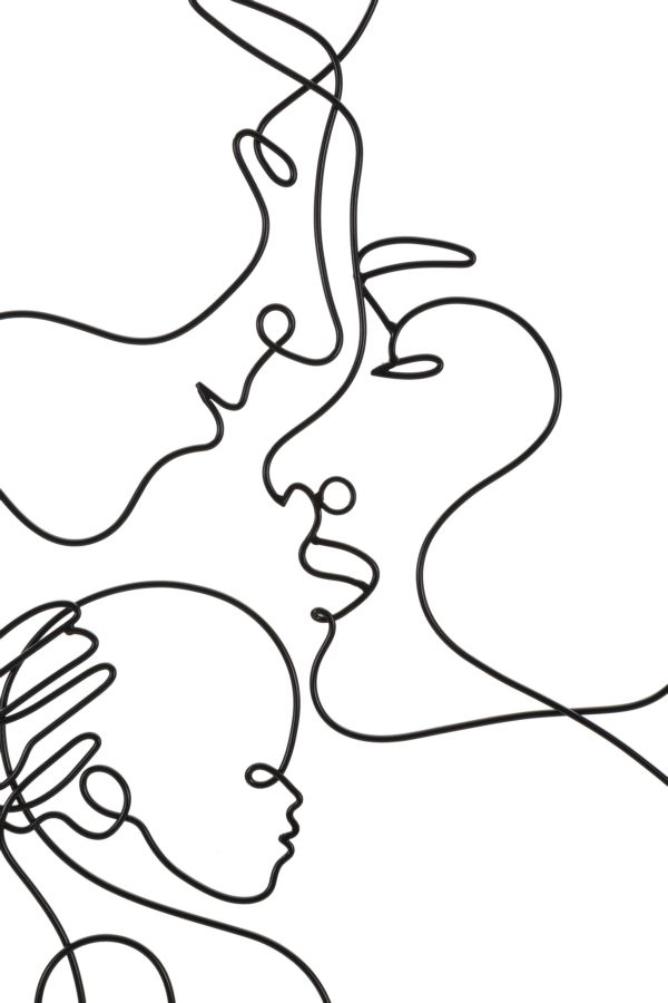 Dekorativt 3D-vægpanel i sort metal med fine, bugtede linjer, der former ansigterne på et par med et barn i armene.