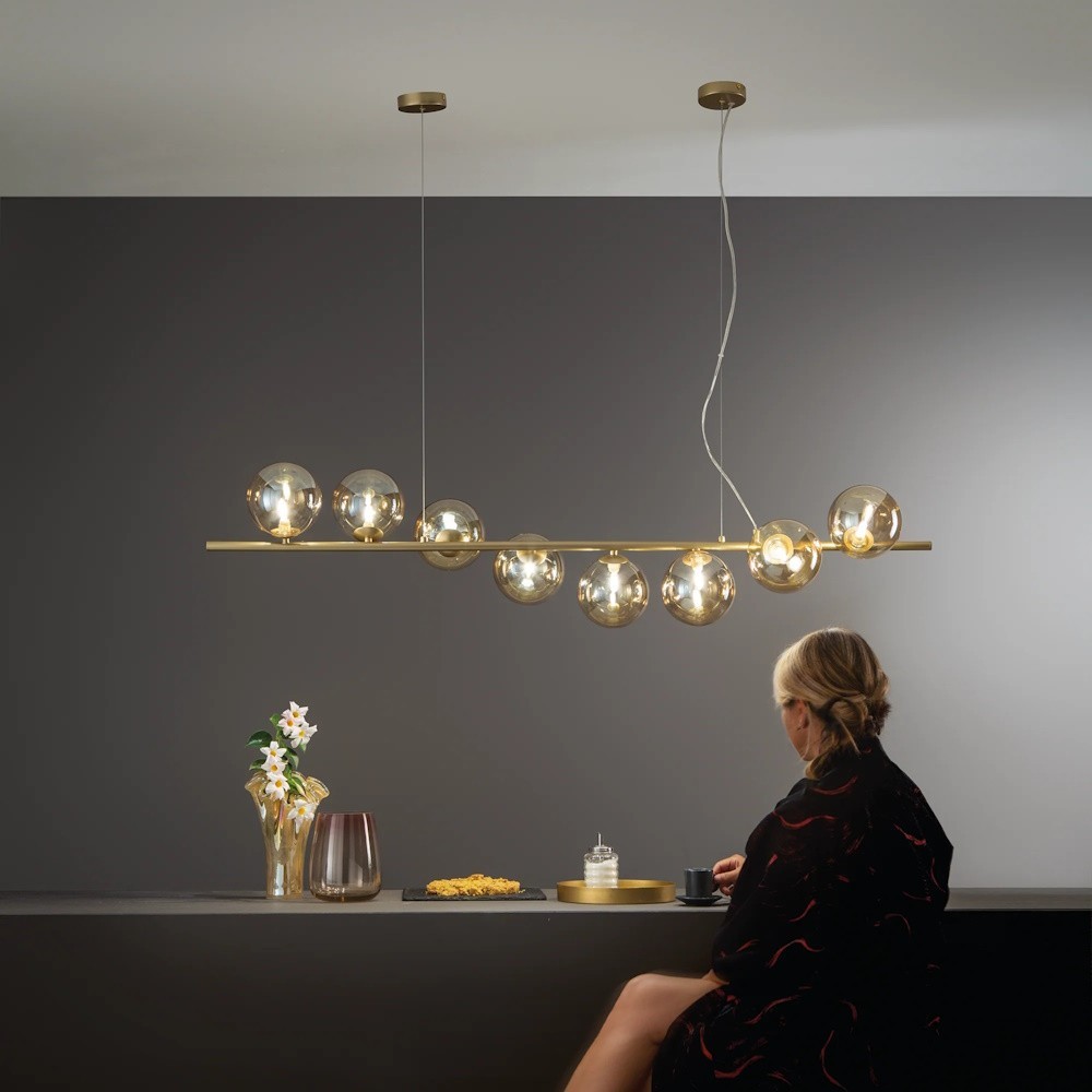 Den honningguldfarvede 8xG9 pendellampe er en lysekrone med et elegant og dramatisk design, perfekt til at forbedre rum med en moderne og raffineret stil. Den guldfarvede struktur tilføjer lysstyrke og karakter til rummene og bliver et sandt dekorativt element.