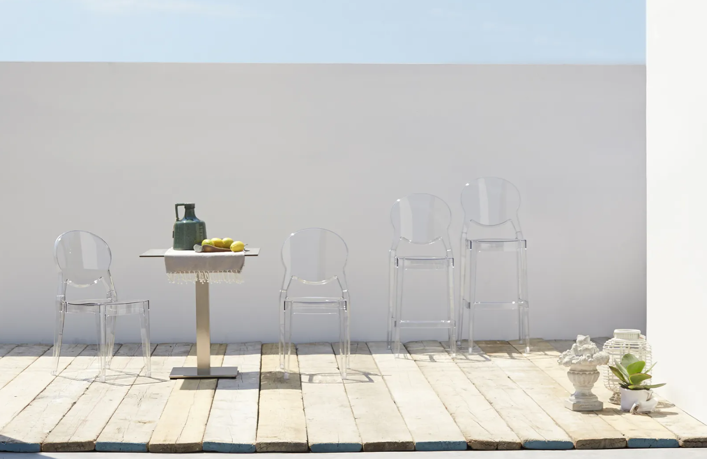 Dets transparente eller farvede design tilføjer et moderne og lyst præg til ethvert rum, mens den solide struktur garanterer stabilitet og holdbarhed over tid.