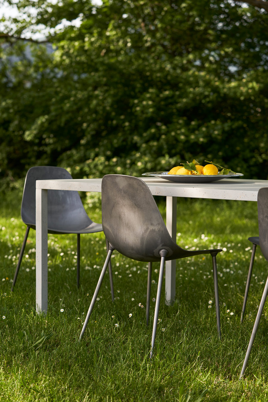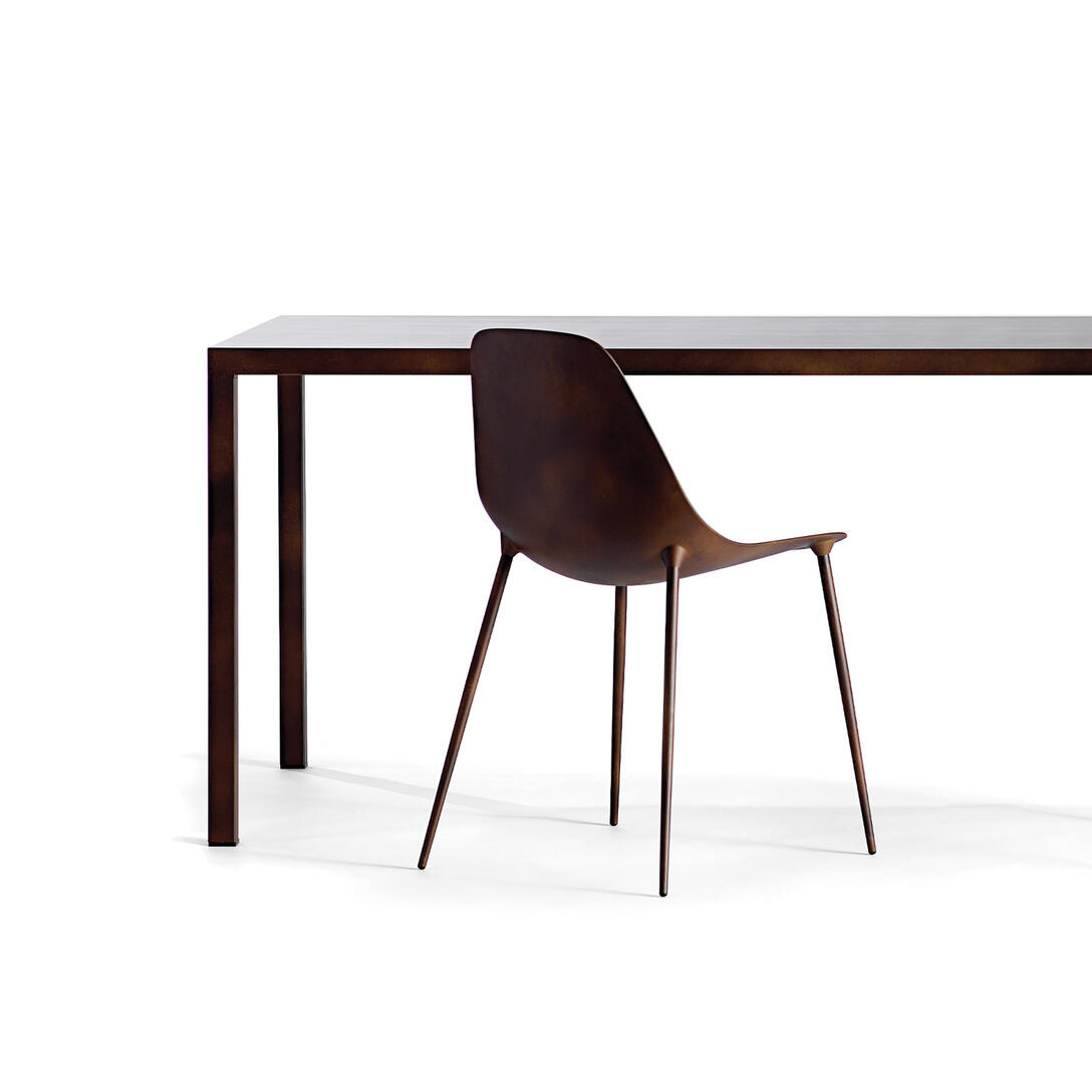Sæde med skal af støbt aluminium og galvaniseret metalstruktur, malet indvendigt/udvendigt, ikke stabelbart.