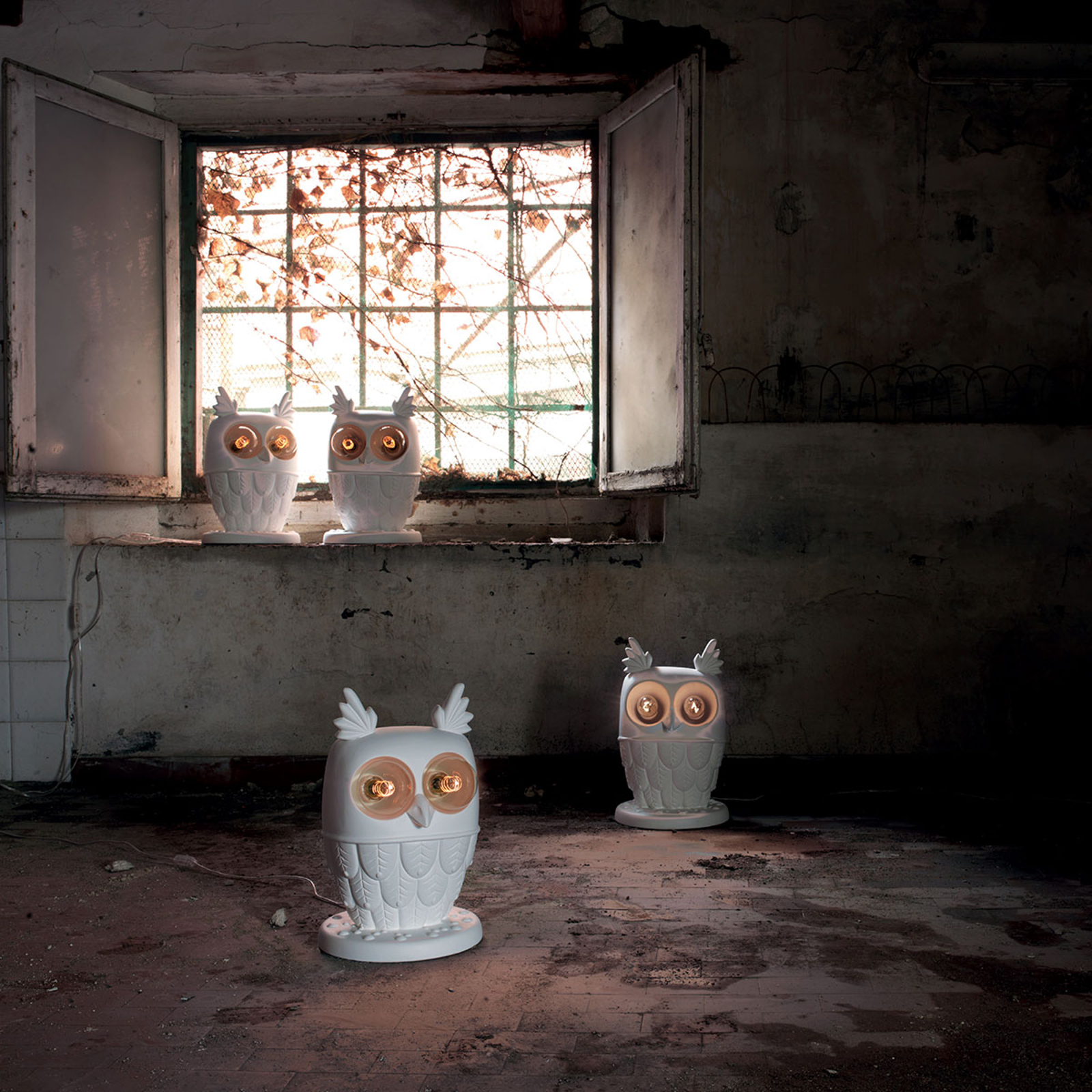 Ti-Vedo, lavet af keramik, er en bordlampe skulptureret i relief for at forestille en sød og sjov ugle, med to pærer, der forestiller fuglens øjne, der kigger ind i mørket.