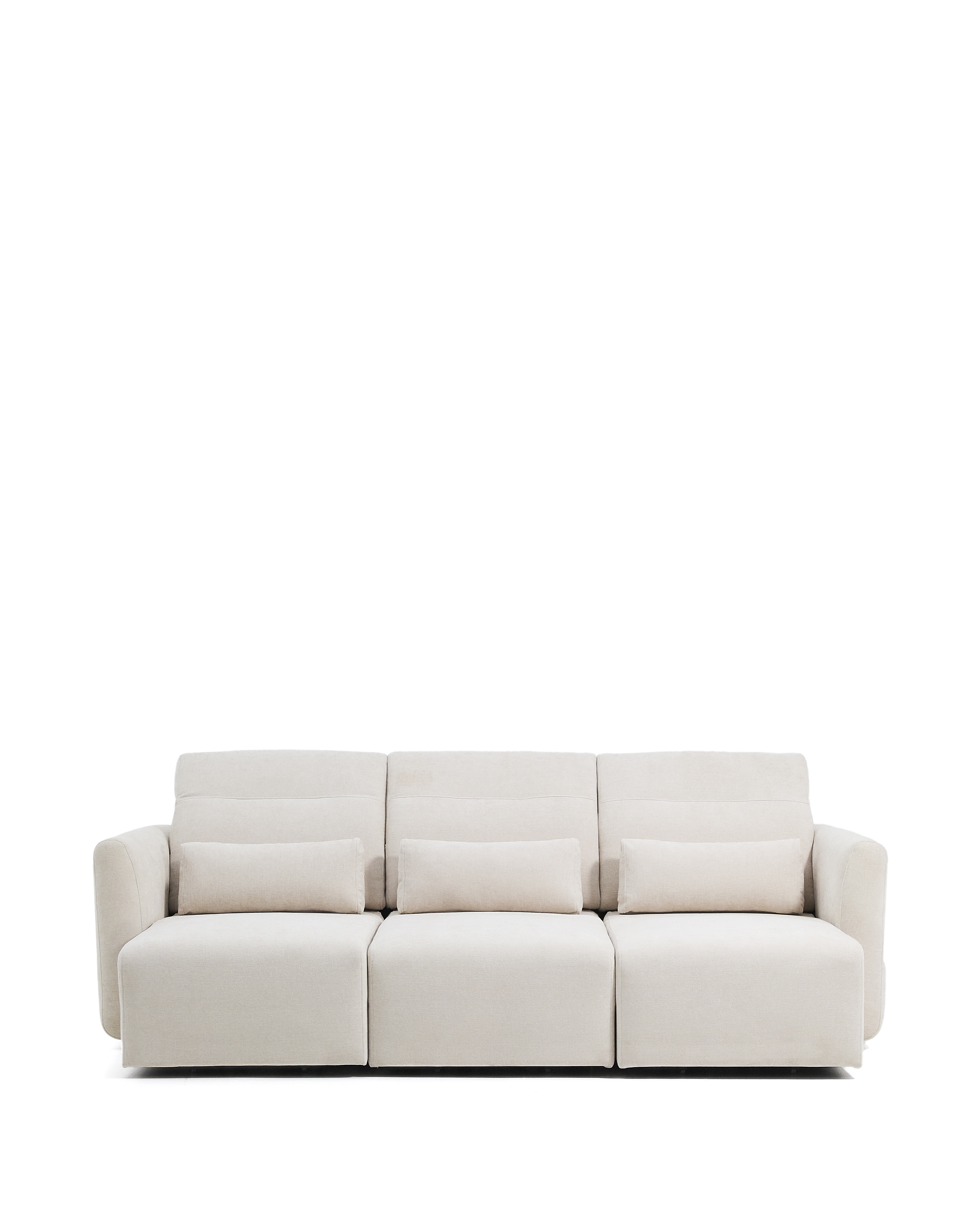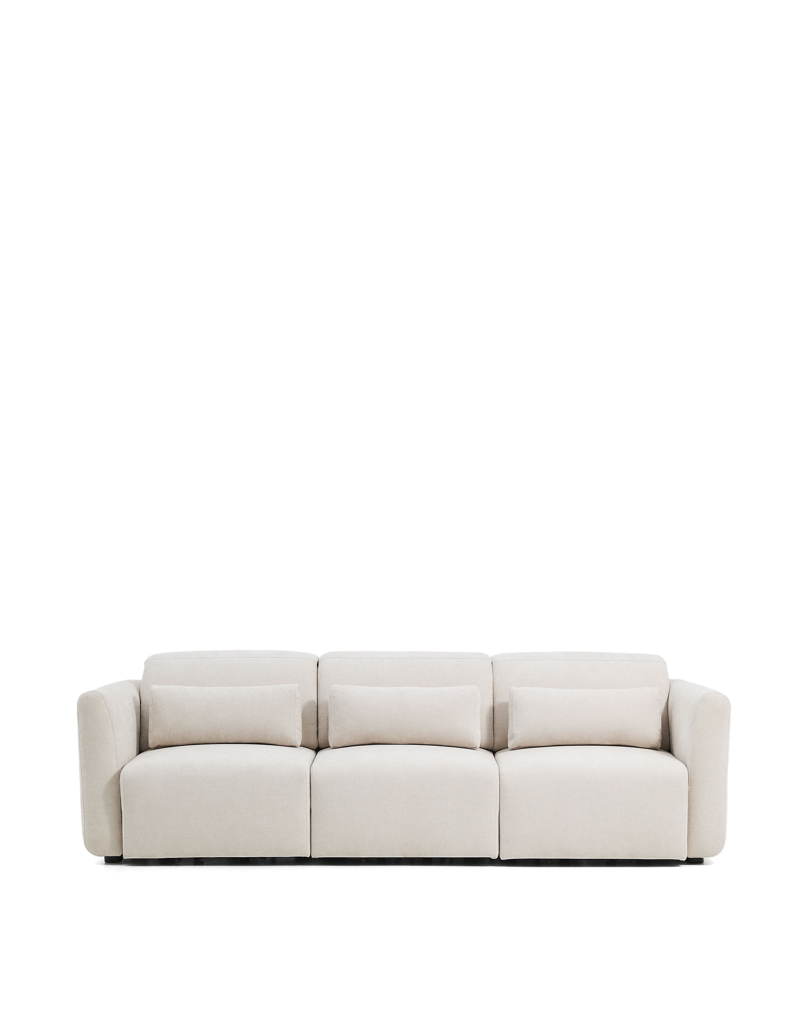 Lares 3-personers sofa med motoriserede skydesæder og nakkestøtte med justerbar ryglæn i beige chenille, 255 cm