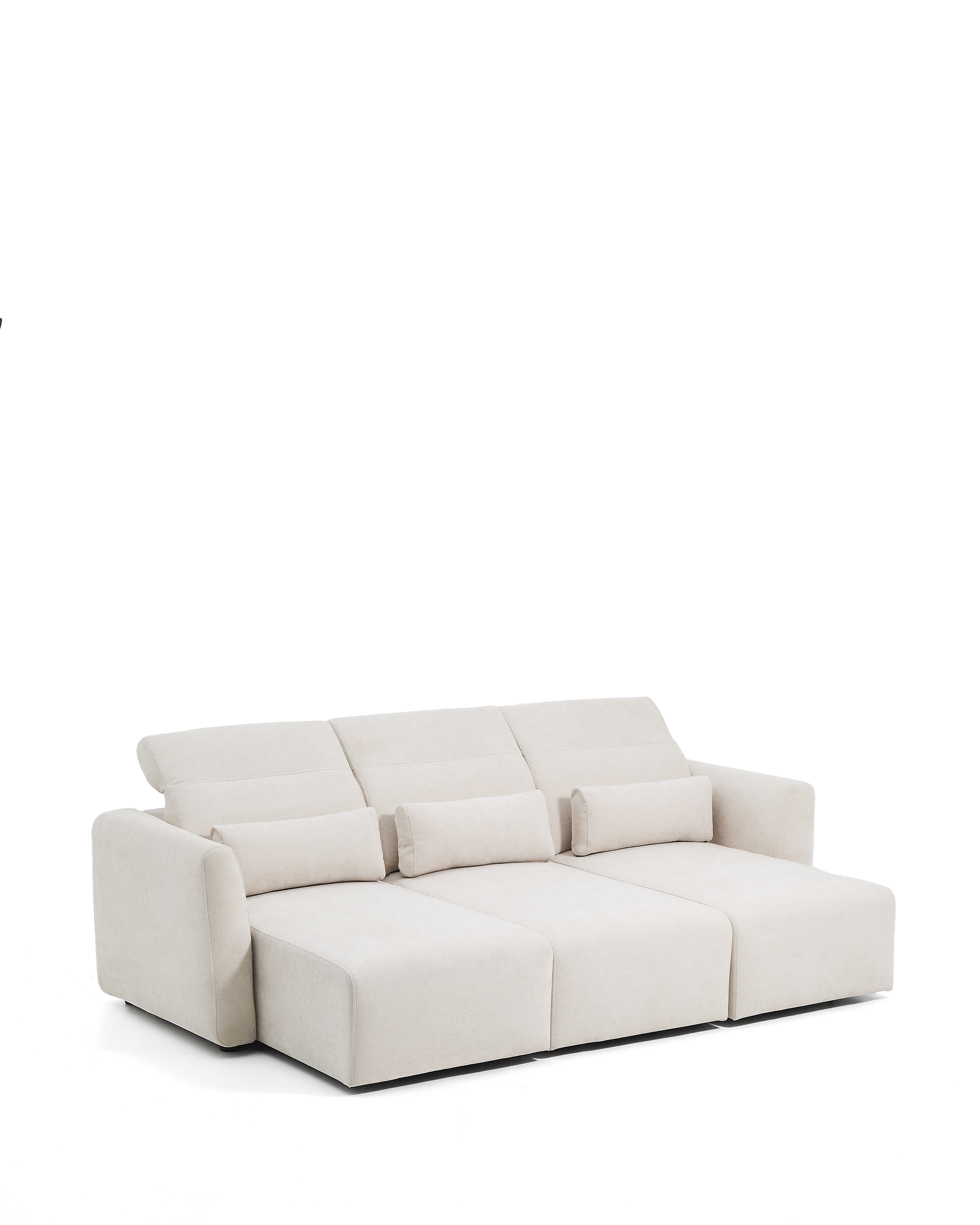 Denne sofa kombinerer design, komfort og teknologi i ét møbel. De motoriserede sæder og manuelt justerbare nakkestøtter giver dig mulighed for at justere din kropsholdning når som helst. Det er en kompakt, udtrækkelig sofa, der kombinerer den laveste dybde på markedet med maksimal udtrækslængde, når den er åben: Når den er lukket, måler den 99 cm dyb, og når den er åben, forlænges den op til 60 cm yderligere. Sædeforlængeren kan forblive åben i enhver position. Bevægelsen kan styres med en trådløs fjernbetjening eller via en Bluetooth-aktiveret smartphone-app, som inkluderer en sikker tilstand til kontrolleret brug. Chenille-polstringen med en fin struktur, fløjlsblød fornemmelse og fremragende modstandsdygtighed over for lys og slid kan maskinvaskes på et skåneprogram. Stoffleverandøren er OEKO-TEX® STANDARD 100-certificeret, hvilket garanterer økologisk sikker og miljøvenlig produktion. Indvendigt kombinerer sædet et NOSAG-fjedersystem med lag af højdensitetsskum (35 kg/m³ og 40 kg/m³), 5 cm 42 kg/m³ viskoelastisk materiale og et lag fibre, hvilket resulterer i et medium-blødt sæde. Nakkestøtterne har aftagelige betræk og er fremstillet af 35 kg/m³ blødt skum, 24 kg/m³ superblødt skum og fibre for større komfort. Denne sofa, der er fremstillet i Europa, tilbyder kvalitet og holdbarhed, samtidig med at den reducerer CO₂-udledningen. Et rummeligt og alsidigt møbel, designet til at bringe gennemtænkt design og innovation ind i din hverdag.