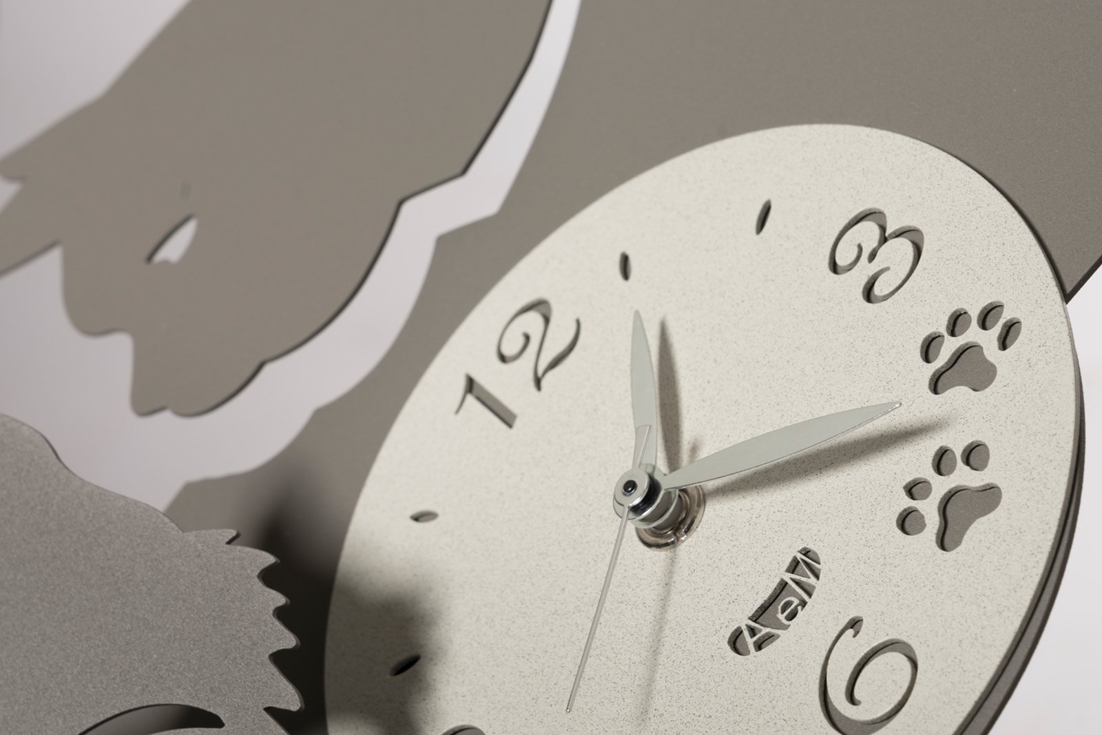 Skiven er en smule til højre for midten. En killing ser ud til at være en smule hævet til venstre, og de små poteaftryk, der dekorerer urskiven, tilhører sandsynligvis den. Kattens silhuet binder det hele sammen (uden at miste killingen af syne, selvfølgelig). Dette produkt fås i tre forskellige farvekombinationer, alle lige alsidige. Sødmen i motivet bliver aldrig gået på kompromis!