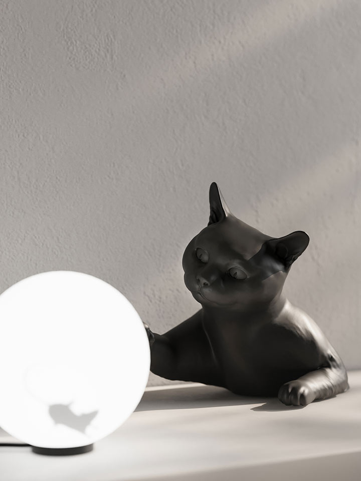 MAOO er lavet af to elementer, kattens krop i mat hvid eller antracitsort keramik og glaskuglen med et indvendigt museformet klistermærke, og kan placeres på væggen eller på et skrivebord, natbord eller køkkenbord.