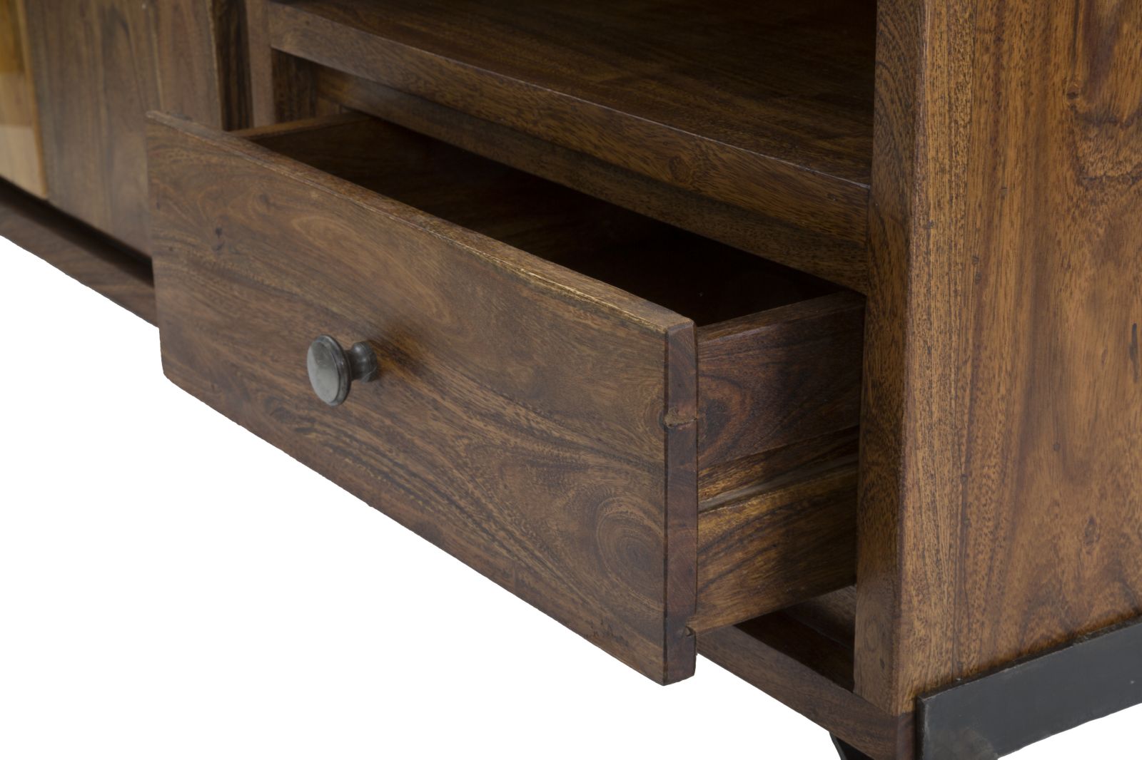 Elegant TV-bord i massivt akacietræ med to hylder, to døre og to skuffer. Den unikke harpiksindlejrede finish på dørene tilføjer et strejf af farve og modernitet til dette yderst elegante og klassiske møbel.