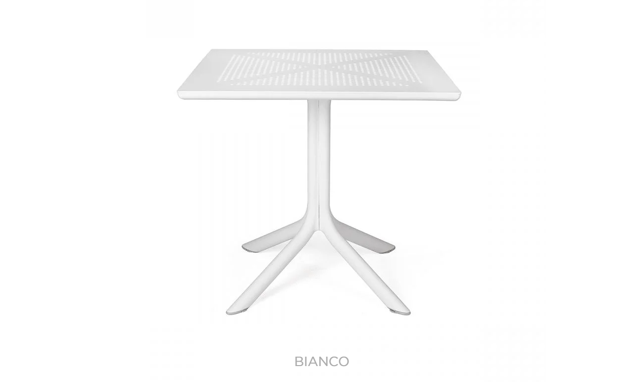 Clip er specielt designet til at optage minimal plads. Det er et professionelt firkantet bord i glasfiberharpiks med et centralt firegret ben og en fotograveret DurelTop-plade med et rundt perforeret mønster.