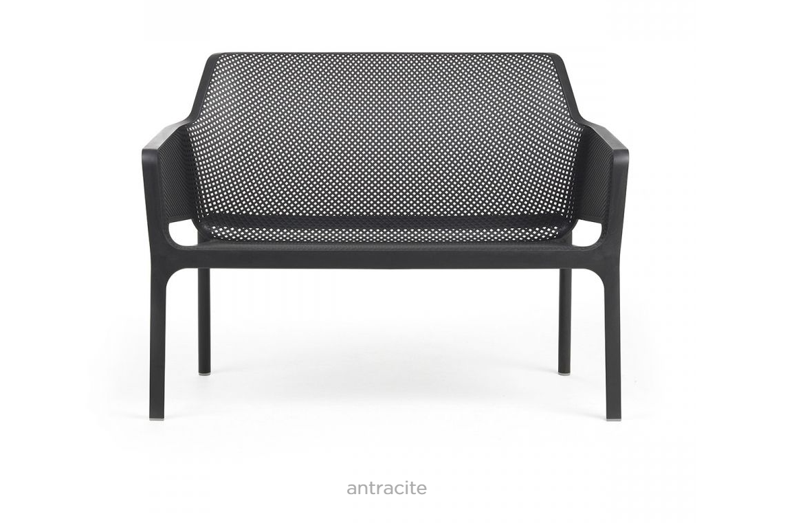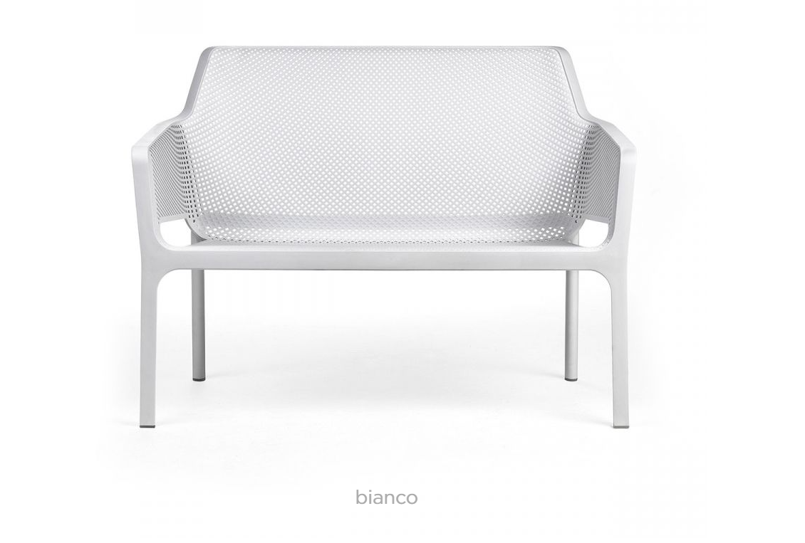 Net Bench er en romantisk og empatisk udendørsbænk med to siddepladser lavet af glasfiberharpiks. Med et firkantet og radialt perforeringsmønster kan den prale af rene linjer, en sømløs, slank profil og et bredt udvalg af hynder.