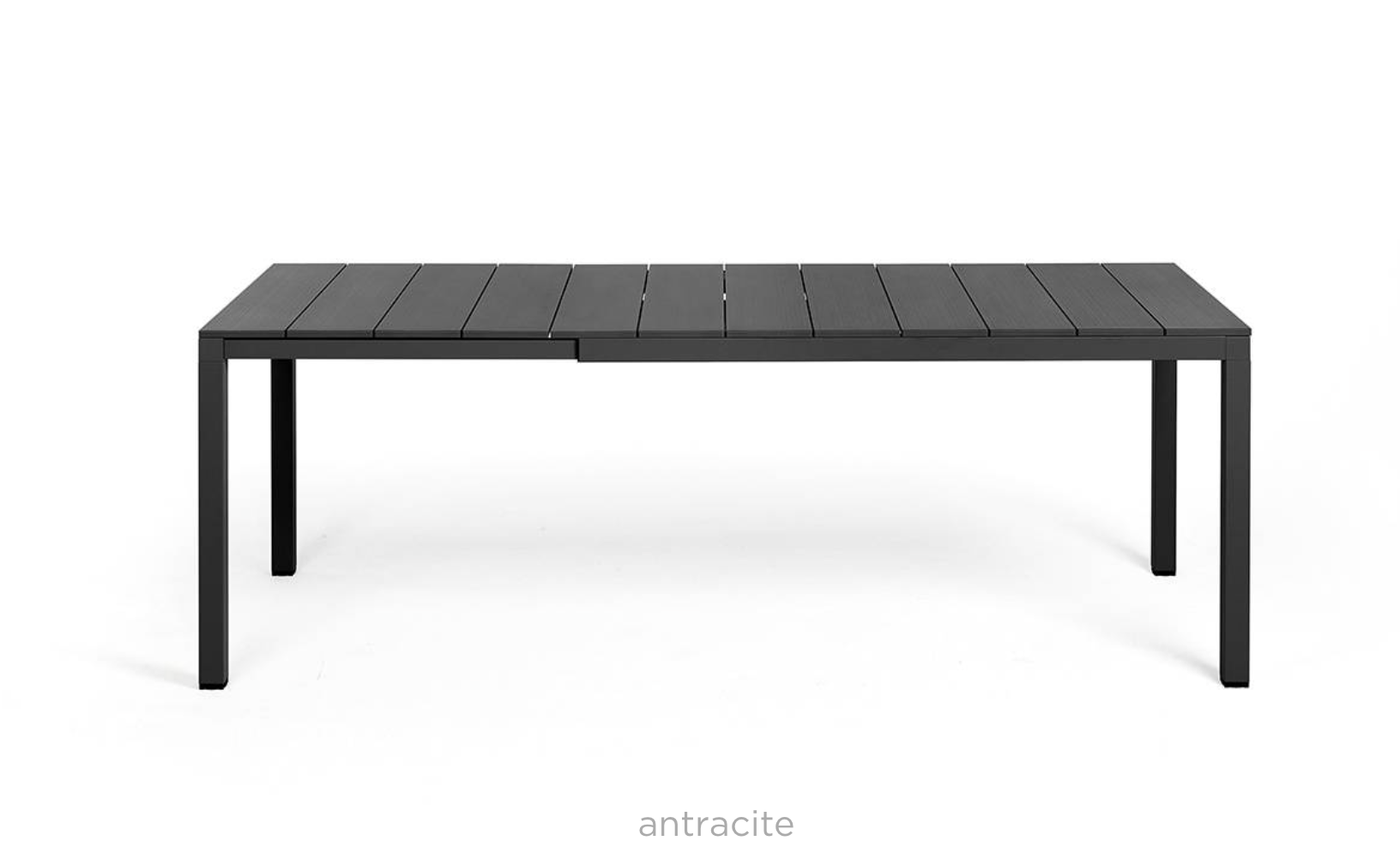 Udtrækkeligt bord med arkitektoniske detaljer og en karakteristisk personlighed. Lameller, let ribbet malet aluminiumsplade og malet aluminiumsstel. Fås i to størrelser for at imødekomme forskellige pladsbehov.
